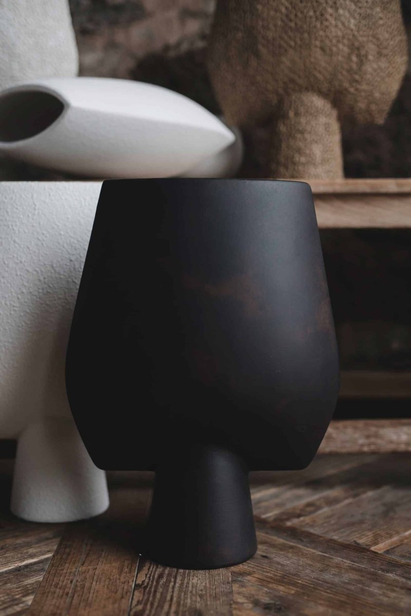 Denna vas är ett konstverk i sig. Den mörka, mattbrända keramiken ger ett djupt och levande uttryck som skiftar subtilt i ljuset, vilket gör varje exemplar unikt.