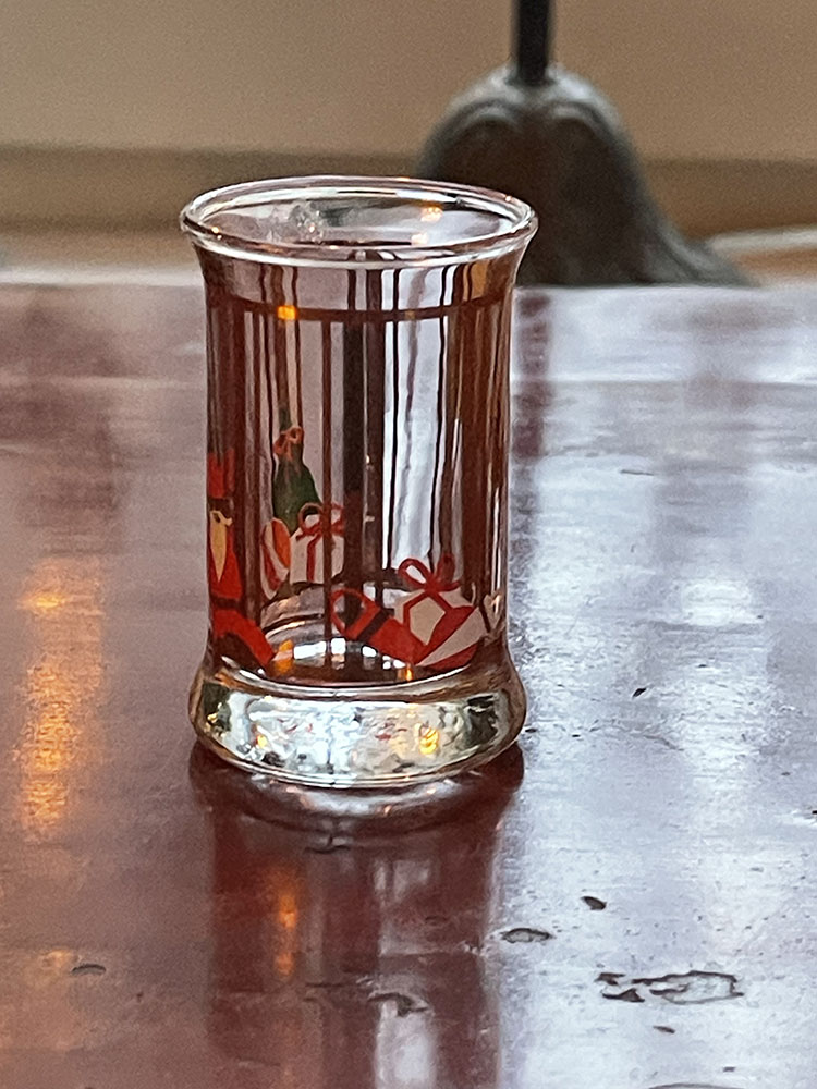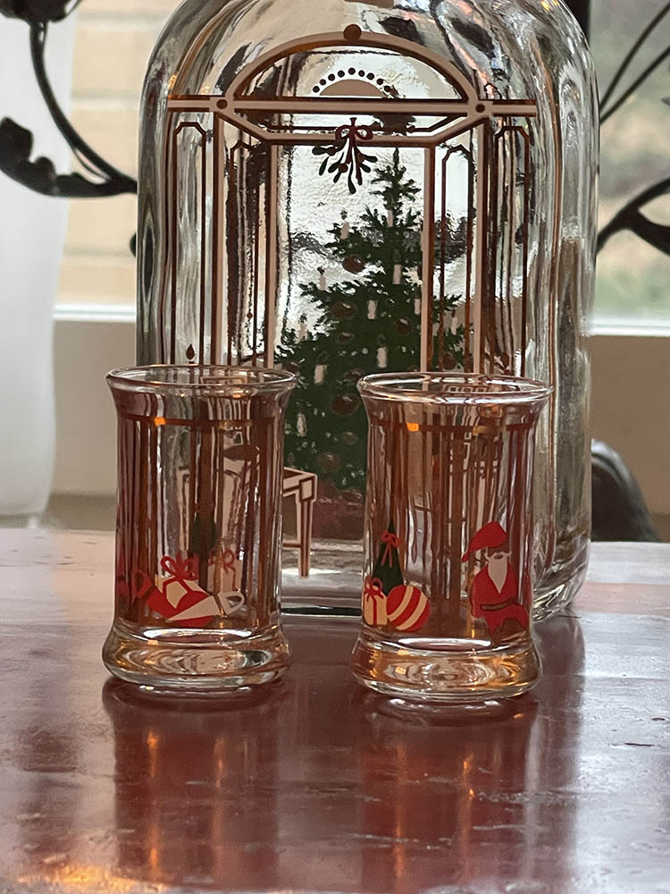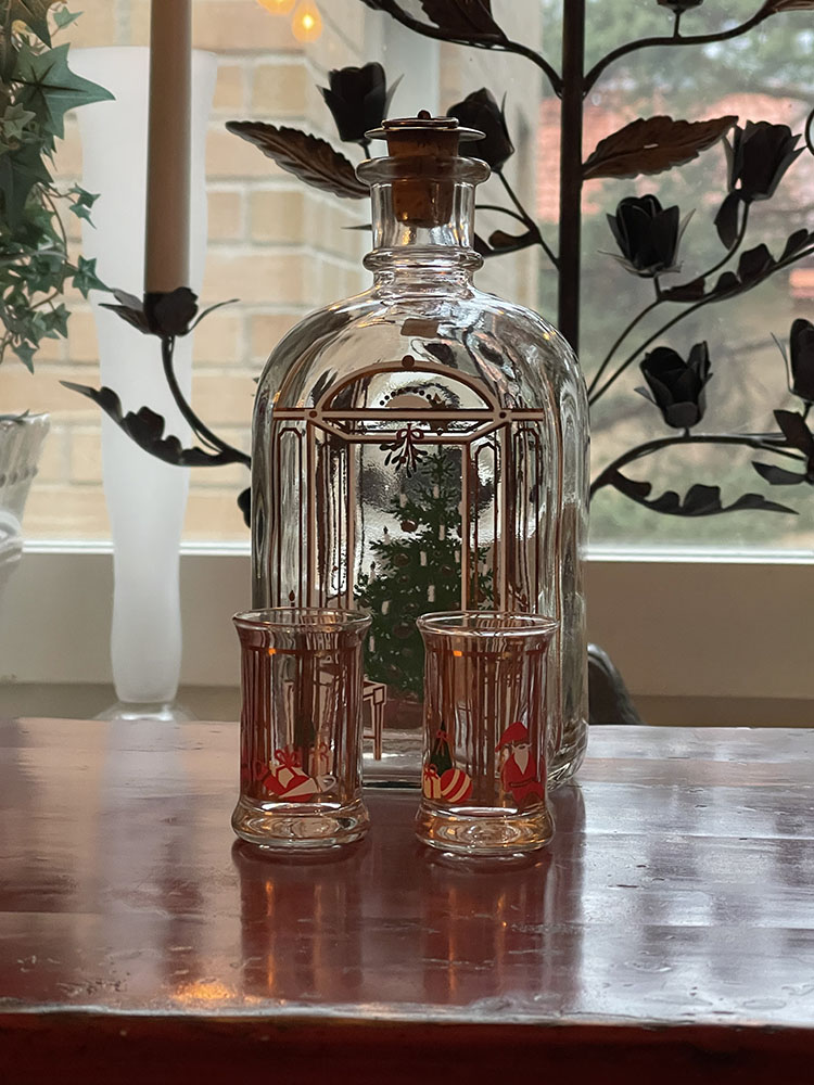 1985 Christmas carafe from Danish Holmegaard. The carafe holds 65 cl. This carafe comes with two matching schnapps glasses. Holmegaard’s glassworks was founded in 1825. In the beginning, they only produced green glass. From being a small glassworks, it has grown into a large modern group over a period of 175 years. The carafe is illustrated by Jette Frölich. In 1976, she was asked if she wanted to be the artist of the year. Since 1980, she has decorated Holmegaard’s Christmas with her beautiful Christmas motifs. Her decorations are particularly well-known on the Christmas carafe. The first carafe came in 1981.