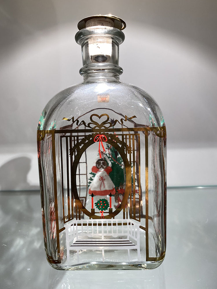 1990 års julkaraff från danska Holmegaard. Karaffen rymmer 65 cl. Holmegaards glasbruk startades 1825. I början tillverkade man enbart grönt glas. Från att ha varit en litet glasbruk har det vuxit till ett stor modern grupp över en period av 175 år. Karaffen är illustrerad av Jette Frölich. 1976 tillfrågades hon om hon ville bli årets konstnär. Sedan 1980 har hon dekorerat Holmegaard’s Christmas med sina vackra julmotiv. Särskilt julkaraffen kommer hennes dekorationer till sin fulla rätt. Den första karaffen kom 1981.