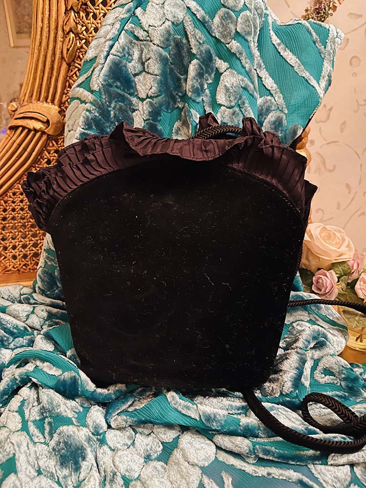 A wonderful vintage bag from Yves Saint Laurent. The model is called Flamenco and the color Noir. It is made of velvet and pleated fabric with a ribbon. On the front is a brooch with YSL’s logo. It measures about 20 x 22.5 cm. The bag is in new condition. Inside, it’s perfect. The bag is from the late 1970s to the early 1980s. It is stored in its dustbag inside the original box. The model is very unusual, I have not seen any further specimens.
