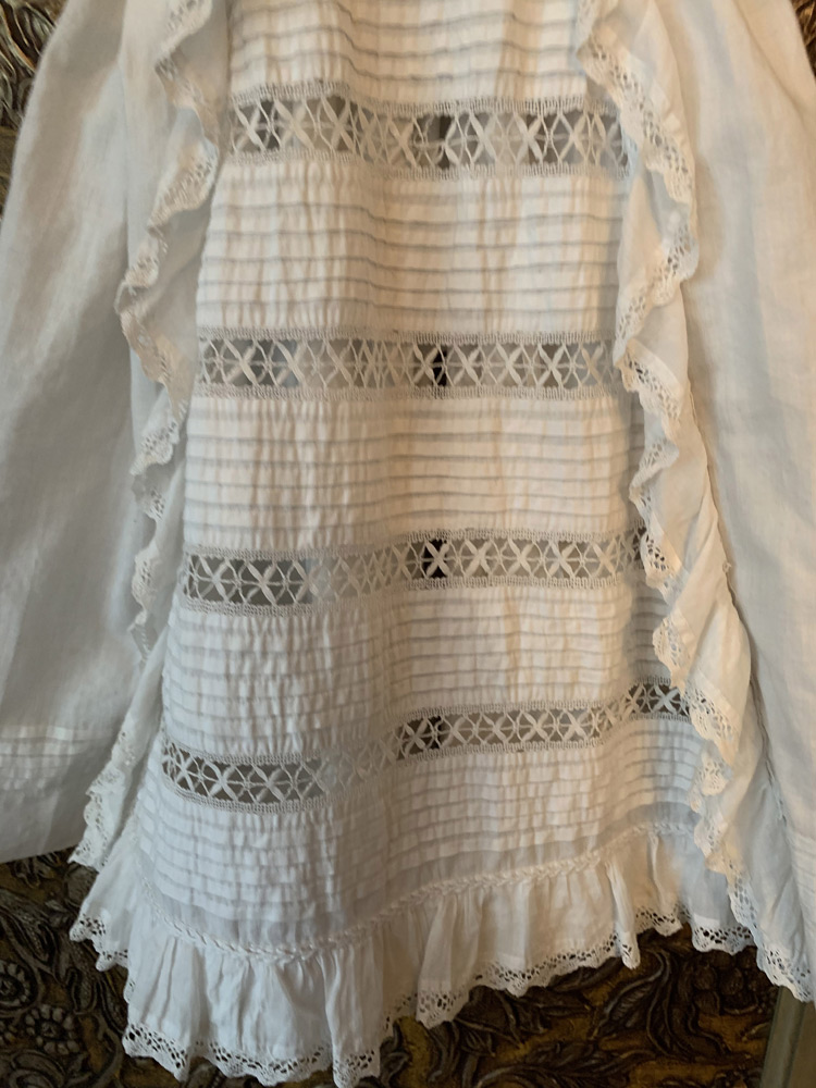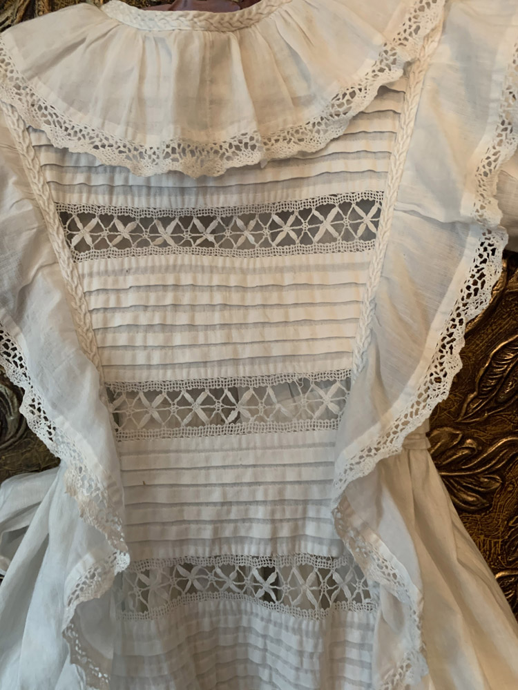 Helt fantastisk dopklänning som enligt uppgift är från 1800-talet. Sömnadsarbetet är helt otroligt. Klänningen är i bomull med infällda spetsar. Den har gulnat något med tiden och det finns både lagningar och små fläckar.