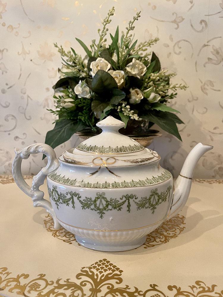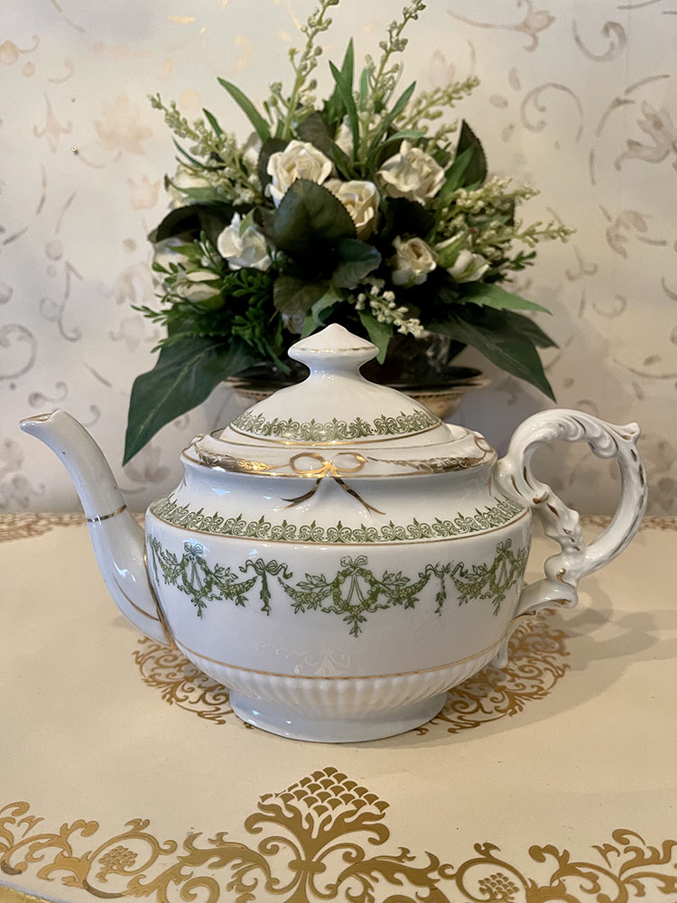 Gracil vacker tekanna i empire. Den är troligen fransk och från 1800-talet. Det här mönstret finns i flera varianter och det finns i en engelsk variant, men den här är troligen fransk då jag hittat de flesta delarna i just Frankrike. Det finns en märkning som ser ut som ett kors och ska väl påminna om Meissen , men det är det inte. Troligen är det en av alla små porslinstillverkare som fanns på den tiden. Kannan är i nyskick och har troligen aldrig varit använd, men det finns lite putsskador på förgyllningen vilket kommer med tiden. Kannan mäter 24 cm från pip till handtag och 15 cm på höjden. Det finns fler delar att köpa separat.