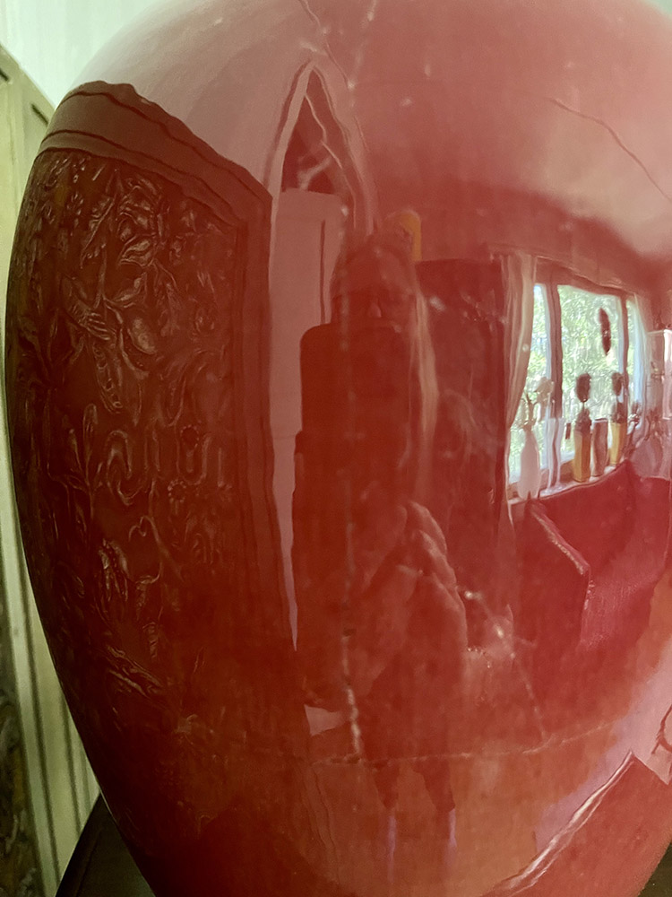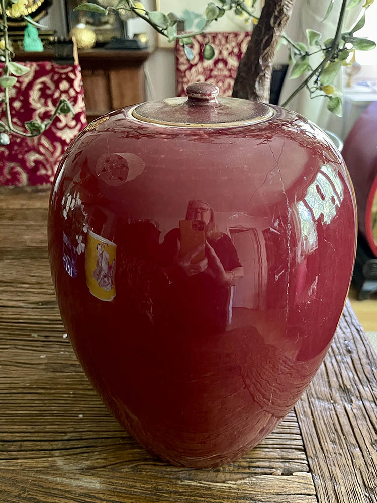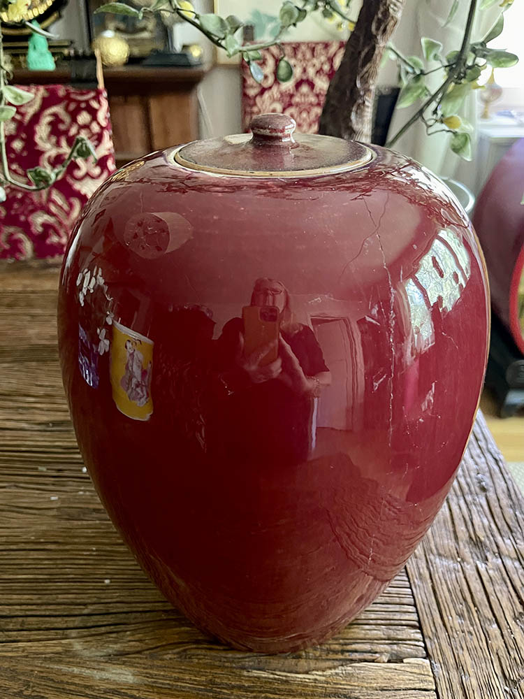 Det här är en antik Kinesisk kruka med lock, troligen avsedd för ingefära. Den är i oxblods glasyr så kallad Sang de Boeuf. Den här typen av glasyr härstammar från Ming Dynastin (1368-1644) den här röda glasyren var väldigt svårt att framställa. Det Kinesiska namnet är Lang yaohong. Den röda glasyren försvann då produktionen av porslinstillverkningen mattades av men återupptogs under Qing Dynastin (1644-1911).Glasyren gjordes mer perfekt och under den här perioden tillverkades flera av de finaste föremålen i den här typen av glasyr .Det var särskilt under Kejsaren Kan-hsi (1654-1722) den fjärde och kanske den bäste regenten under Qing-dynastin. Den här krukan är väldigt gammal, jag skulle tro att den är tidigt 1800-tal men kan vara äldre. Den är stor, mäter cirka 30 cm med lock och ca 20 cm rakt över. Dessutom är den tung, den väger 3,20 kilo. Det finns sprickor i krukan vilket jag har försökt att fånga på bild. Det syns inte om man inte tittar väldigt noga men oftast förekommer det alltid på så gamla bruksföremål. Det finns skador i öppningen som framgår av bilderna och på bottendelen ser man att den både är gammal och välanvänd. Det här är en ovanlig kruka och den är sagolikt vacker i sin djupa oxblodsfärg.