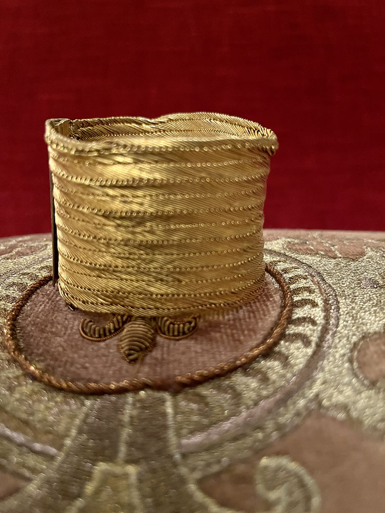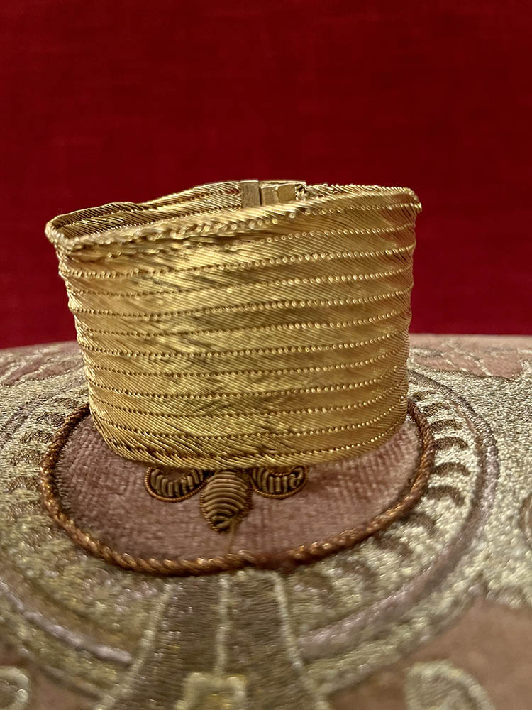 Mycket vackert armband från 1800-talet. Det är tillverkat i pinsback, vilket är en mässingslegering bestående av cirka 90 procent koppar och 10 procent zink. Det användes ofta förr i stället för guld som var för dyrbart för de flesta. För att det inte skulle mörkna med tiden förgyllde man ofta smycket som med det här armbandet. Armbandet består av flätade trådar med ett spänne längs fram som stängs med en klämma. Armbandet har använts och har en del skador som lagats vilket framgår av bilderna, men det är så otroligt vackert fortfarande. Armbandets fulla längd är 19 cm.