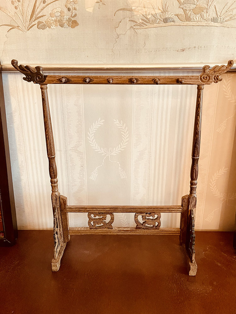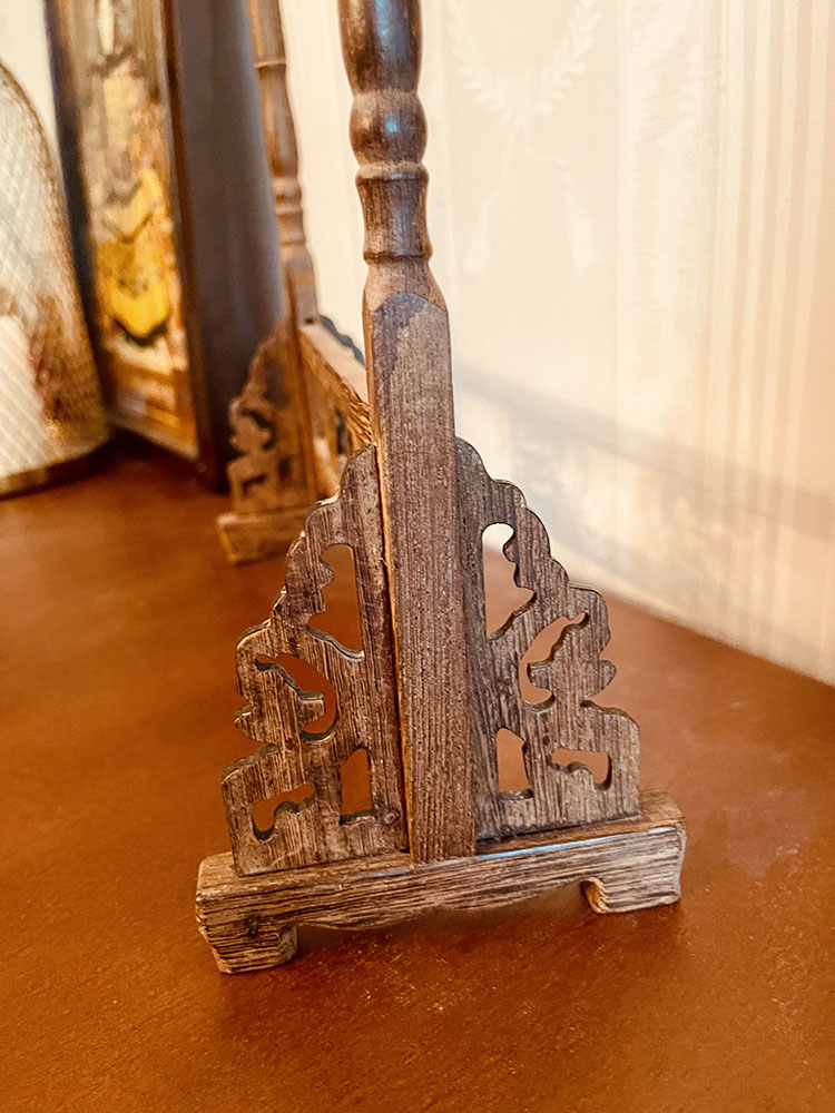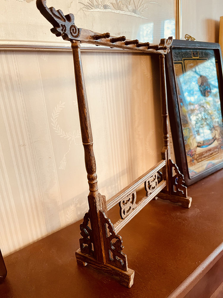 Det här är ett kinesiskt penselställ från sekelskiftet 1800-1900. Stället är från Qingdynastin (1636-1912). Av vad jag kan se är den troligen gjord i rosenträ. Den är gjord på det klassiska sättet där delarna sitter ihop utan spikar eller lim utan de sitter ihop med anpassade fogar. Den har den traditionella utformningen av mönstret på sidorna och drakhuvudena längst upp. Den är skör då träet har torkat och det finns en nästan osynlig liten lagning i dekoren på sidan där en bit har gått av och blivit tillbakasatt. Allt sitter på plats och det finns inga andra skador. Stället är i mycket fint skick för sin ålder. Det är avsett för kalligrafipenslar som visas på sista bilden, men penslarna medföljer inte men finns att köpa separat. Penselstället mäter 36 cm på höjden, 34 cm på bredden och är 11 cm djup.