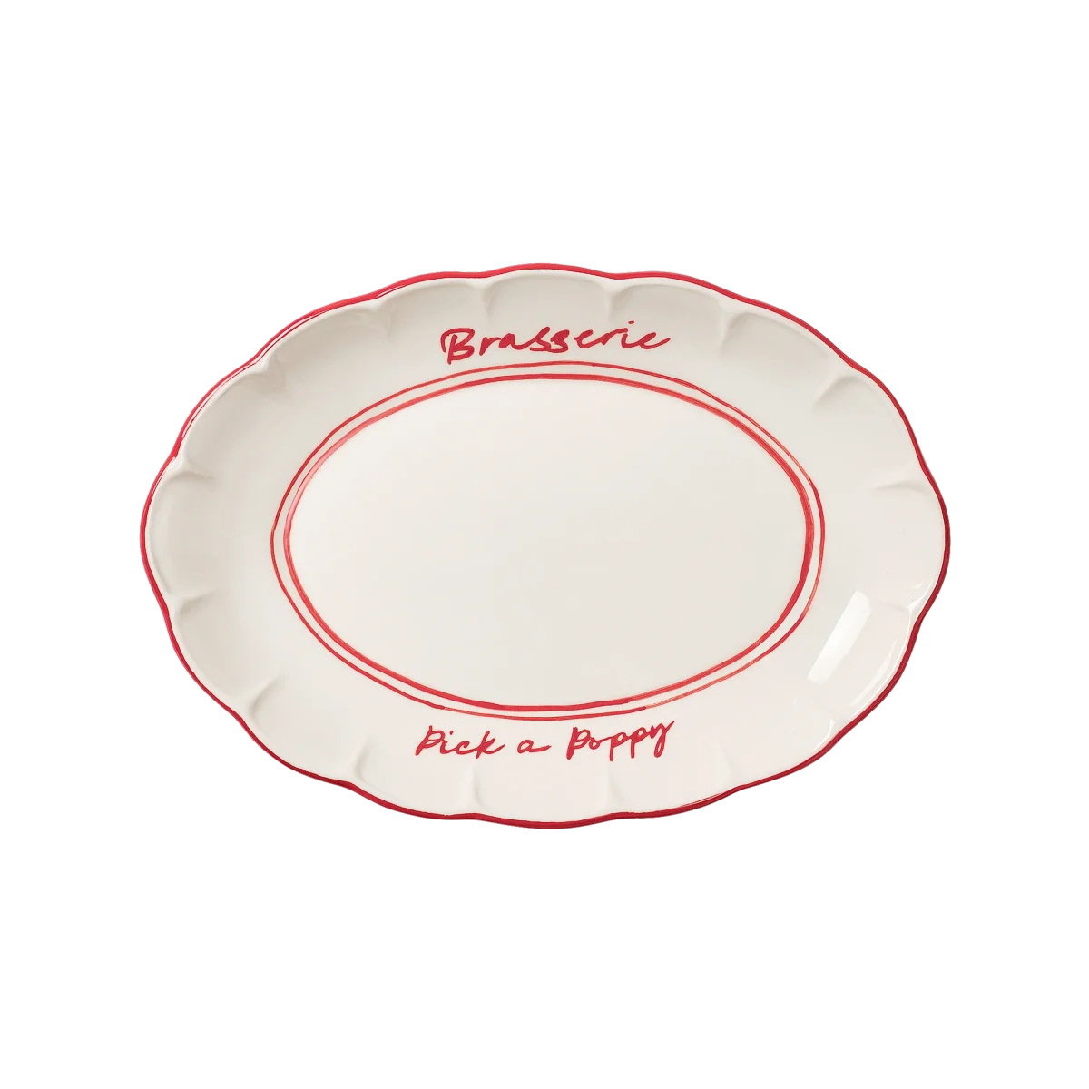 Detta serveringsfat är en del av vår kollektion Bistro. Fatet är handgjort och handmålat av konsthantverkare i Portugal och adderar en avskalad men tidlös känsla till varje dukning. Den klassiska vita designen får liv genom färgade detaljer och sin vackert inramande kant.
