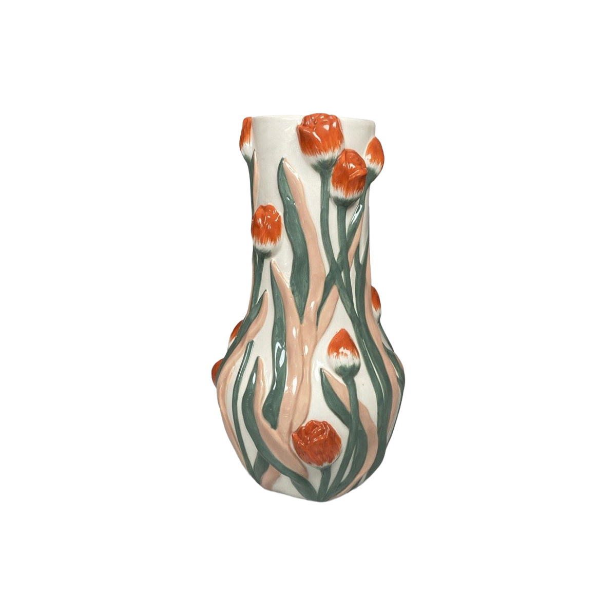 Handmålad vas med motiv av röda tulpaner. Bör endast diskas förhand.
