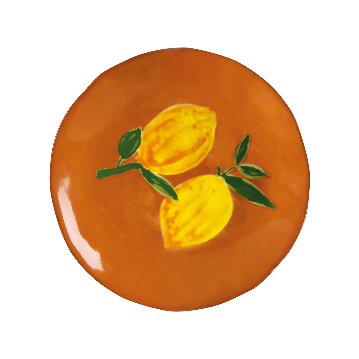 Dekorativ brun assiett med citronmotiv. Perfekt som desserttallrik, förrätts- eller frukostassiett. Vacker att duka bordet med.