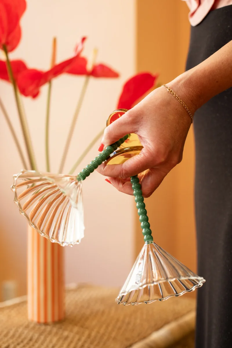 Set med 2 gröna Coupe Perle – glas från &Klevering – stilfulla, klart glas med färgad fot. Perfekta för drinkar, bubbel, eller dessert.