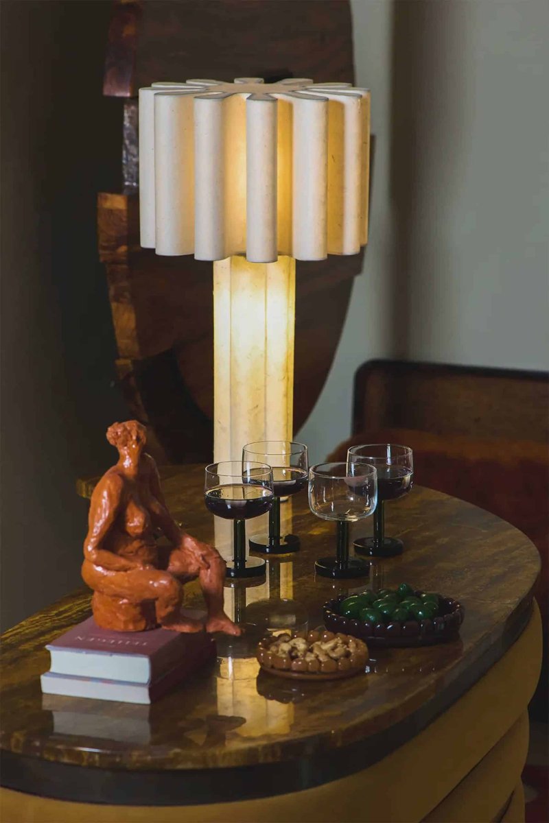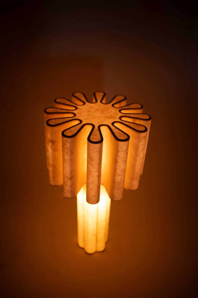 Bordslampa i papper som ger ett mjukt, stämningsfullt sken – ett stilrent inslag i det moderna hemmet. Lampan är tillverkad i handskuret papper, vilket gör varje exemplar unikt.