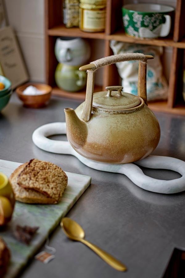Ikigai-tekannan är tillverkad av stengods och har en rustik charm i olika nyanser av brunt och beige. Handtaget är utformat för enkel hantering, och det breda locket upptill säkerställer att dryckerna håller sig varma. Tekannan fungerar både som ett praktiskt tillskott och ett dekorativt element. Glasyrens natur kan orsaka färgvariationer.