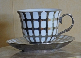 Stor tekopp från Yamasen, Japan med äkta förgyllning. Kopparna och faten är vita med rutor i vitt guld. Koppen är 7,5 cm hög och nio cm i diameter. Fatet är 13,5 cm i diameter. De är nya och oanvända.