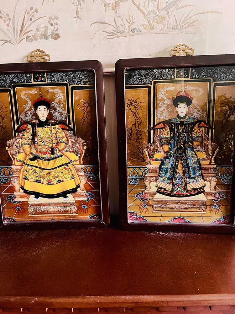 I Kina har sedan Shangdynastin (1600-1050) före Kristus funnits en form av dyrkan och hyllning av avlidna släktingar. Det finns belägg för att forntida Kungar höll religiösa ceremonier där de offrade till tidigare Kungar och bad för ledning om framtiden. Med tiden spred sig sedvänjan till hela den Kinesiska kulturen. Det skapades porträtt av de avlidna som placerades på ett altare. Idag placerar man oftast ett foto på den avlidne på ett altare som respekt och för att ge utrymme att sörja den kära avlidne släktingen. Det här är ett par tavlor målade på glas. De målas omvänt rakt på glaset, en gammal teknik. Tavlorna avbildar en Kejsare och hans hustru. De här är en senare avbildning från vad jag tror 1900-talets mitt. Tavlorna är inköpta 2008 i Lijiang, Kina 2008 men köptes i en antikbutik. Glastavlorna är inramade i en träram med ett klassiskt Kinesiskt mässinghänge. De är mycket välgjorda och har endast ett lätt bruksslitage. De mäter 38,5 X 27,5 cm och hänget mäter 3 X 5 cm.