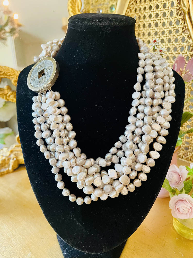 Incredibly beautiful pearl necklace with eight rows of baroque pearls. The necklace has a large clasp with an old Chinese coin set in it. The clasp appears to be silver and has a stamp on the back that cannot be deciphered, which means that it is not possible to guarantee whether it is real silver and the same goes for the coin, it does not have to be antique. The pearls have a light gray hue and even there I cannot say if they are dyed or if it is the original color of the pearls. Freshwater pearls can have several different shades such as white, pink gray, etc., but the pearls here have a nice luster. I think the necklace is vintage, from the mid-20th century onwards. The pearls vary slightly in size, between 7-8 mm. The length of the rows varies between 44-46 cm, and with the clasp the necklace measures about 46 cm. This means that it sits high against the neck. The necklace is heavy and weighs 174 grams. The necklace is in perfect condition and looks unused. The necklace comes with a bracelet that can be purchased separately.