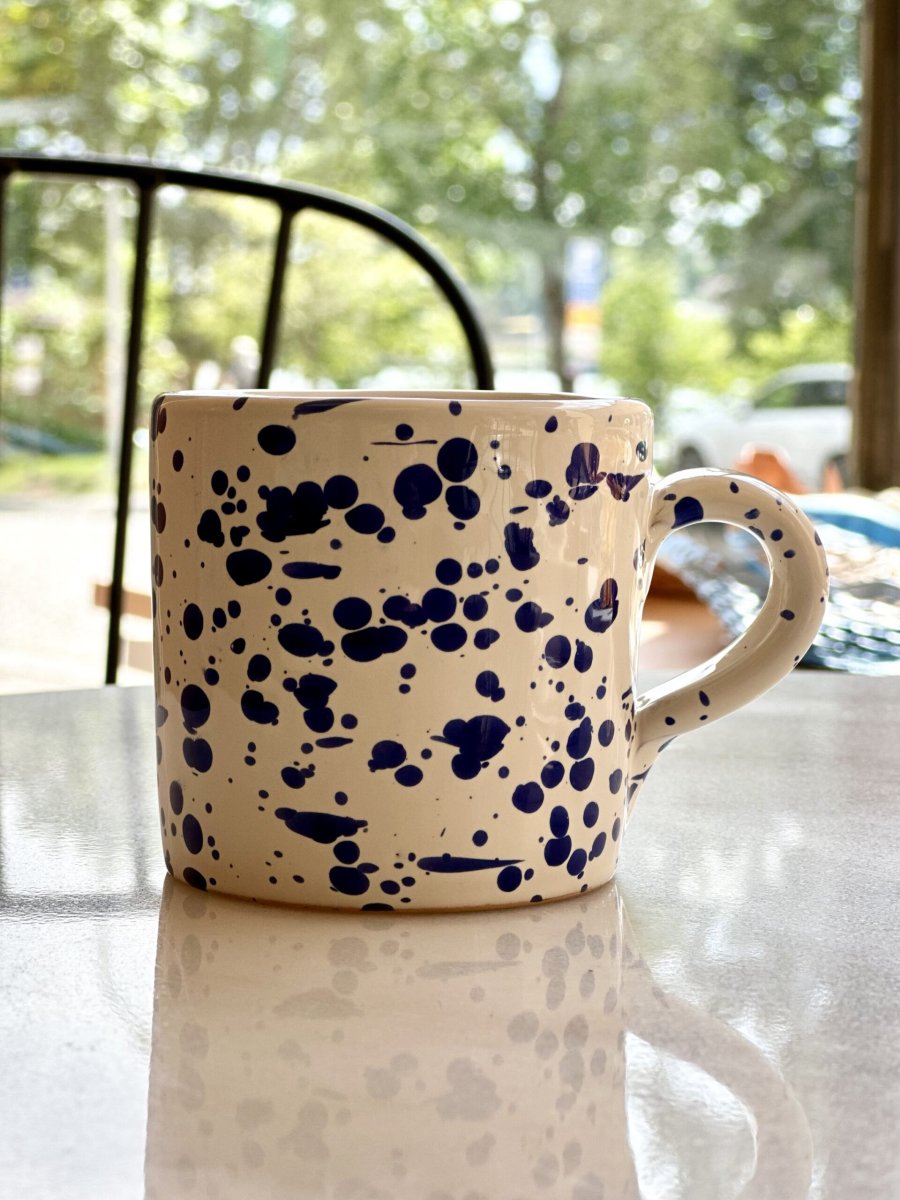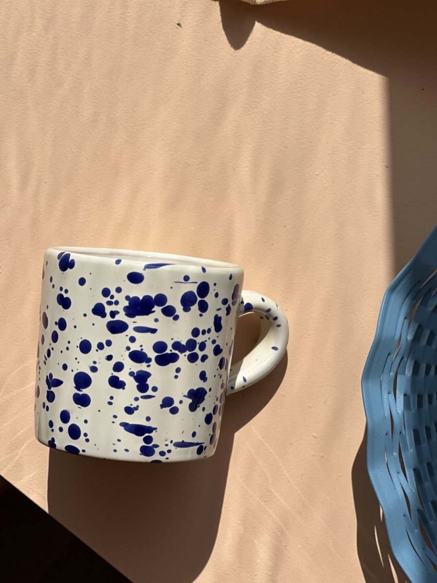 Keramikkopp med de blå Spruzzi mönstret, handgjord i Italien. Unikt stänkmönster, perfekt för kaffe, te eller varm choklad.