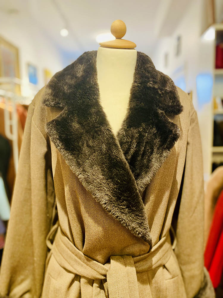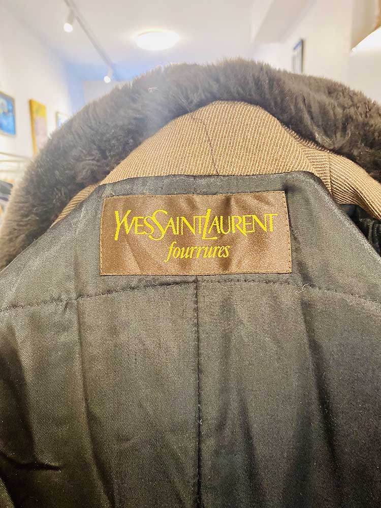 Elegant kappa i ull från Yves Saint Laurent. Kappan är i 100% ull och har päls på krage och ärmar. Pälsen är nutria och storleken är 40 vilket verkar stämma. Kappan är använd men i mycket gott skick. Färgen på kappan är något mörkare vilket framgår på de första bilderna. Jag tror att den är från hans senare kollektioner, kanske i slutet av 1900-talet.