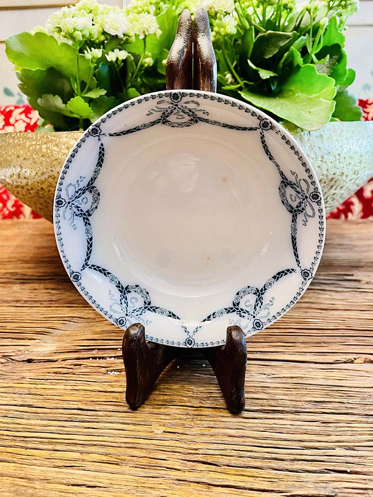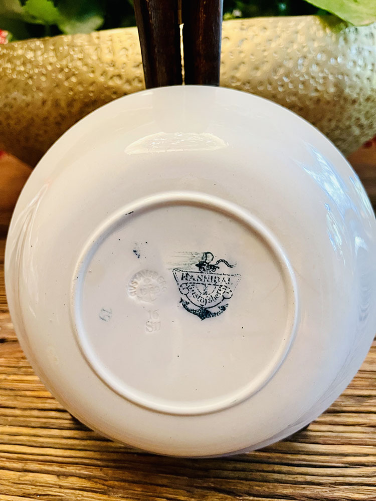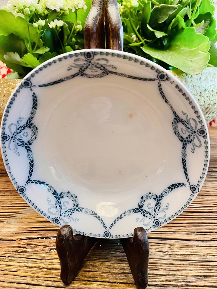 Här är ytterligare en vacker servis i empirestil från Gustafsberg. Den är inte från 1800-talet men antik då den tillverkades mellan 1913-1930. Den är i flintgods och det finns olika delar i den här servisen. Den är i koppartryck och färgen är blågrön som flera av de här serviserna är från den här tiden, vilket gör att det är lätt att blanda olika modeller. Som oftast från den här tiden är den väl använd och det finns både krackeleringar, missfärgningar och mindre skador. Vi kommer att försöka beskriva defekterna så noga som möjligt.