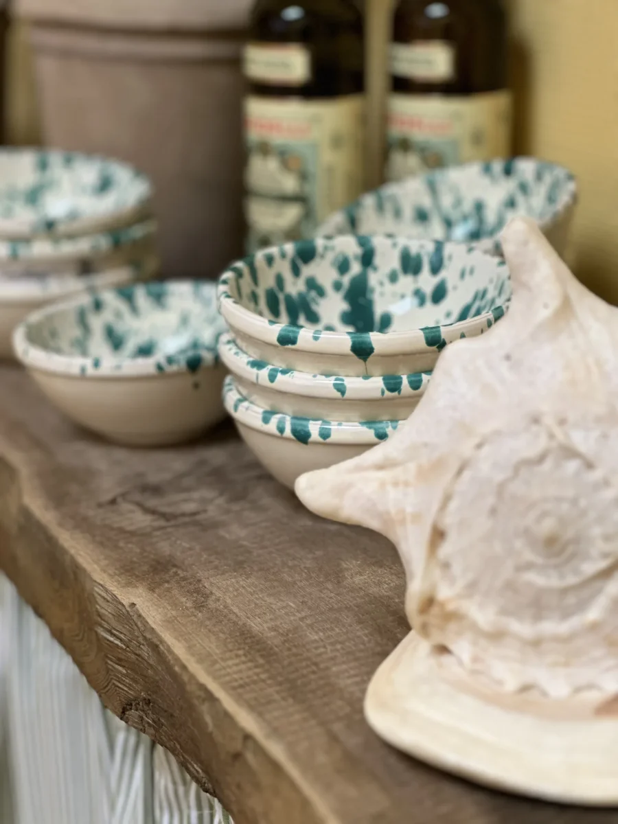 Handmålad liten grön keramik skål i spruzzi mönstret från Italien. Perfekt för snacks, frukost eller som en dekorativ detalj i ditt hem.