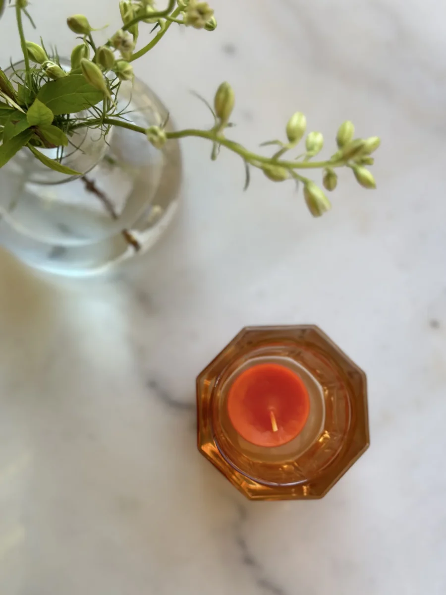 Varmt orange ljuslykta i glas, ger ett mjukt sken och blir en färgklick i rummet. Perfekt för mörka kvällar och middagsbjudningar.