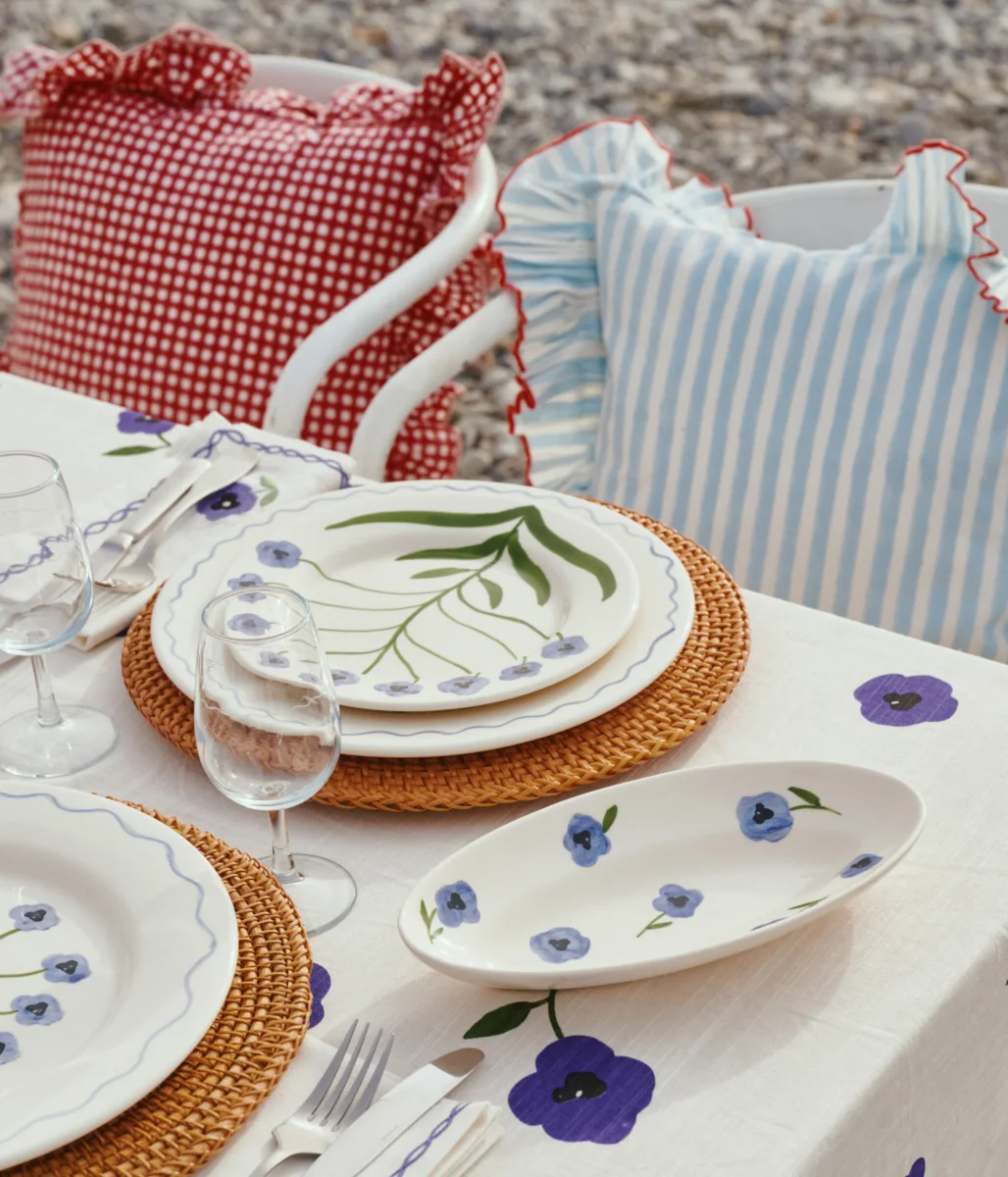 Serveringsfatet Pansy är designat av svenska konstnären och designern Madelen Möllard och skapat av lergods med skickligt hantverk i Portugal. Fatets blommiga motiv skapar ett varmt uttryck och den passar lika fint till dukning för vårens luncher som sommarens middagar.