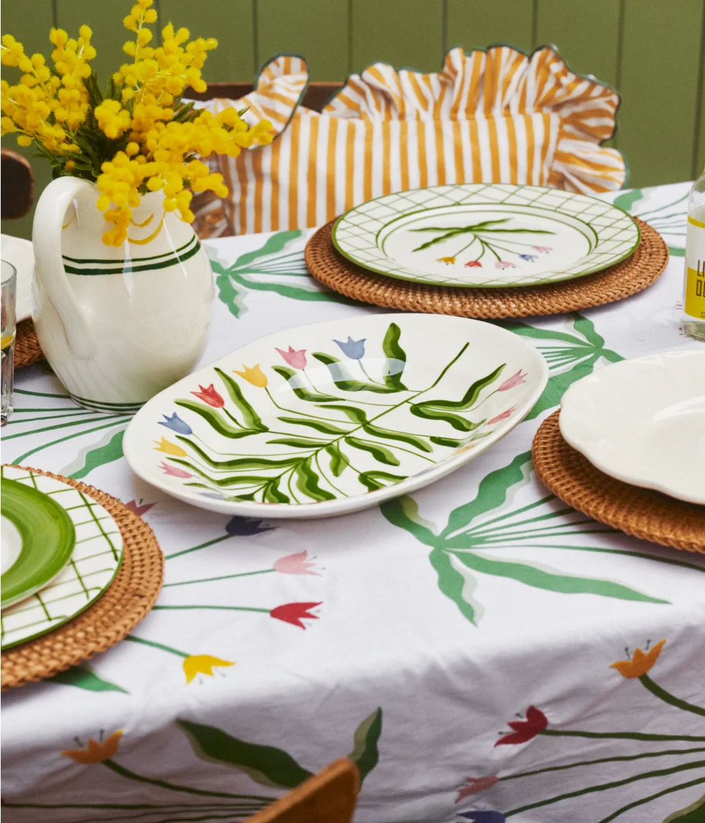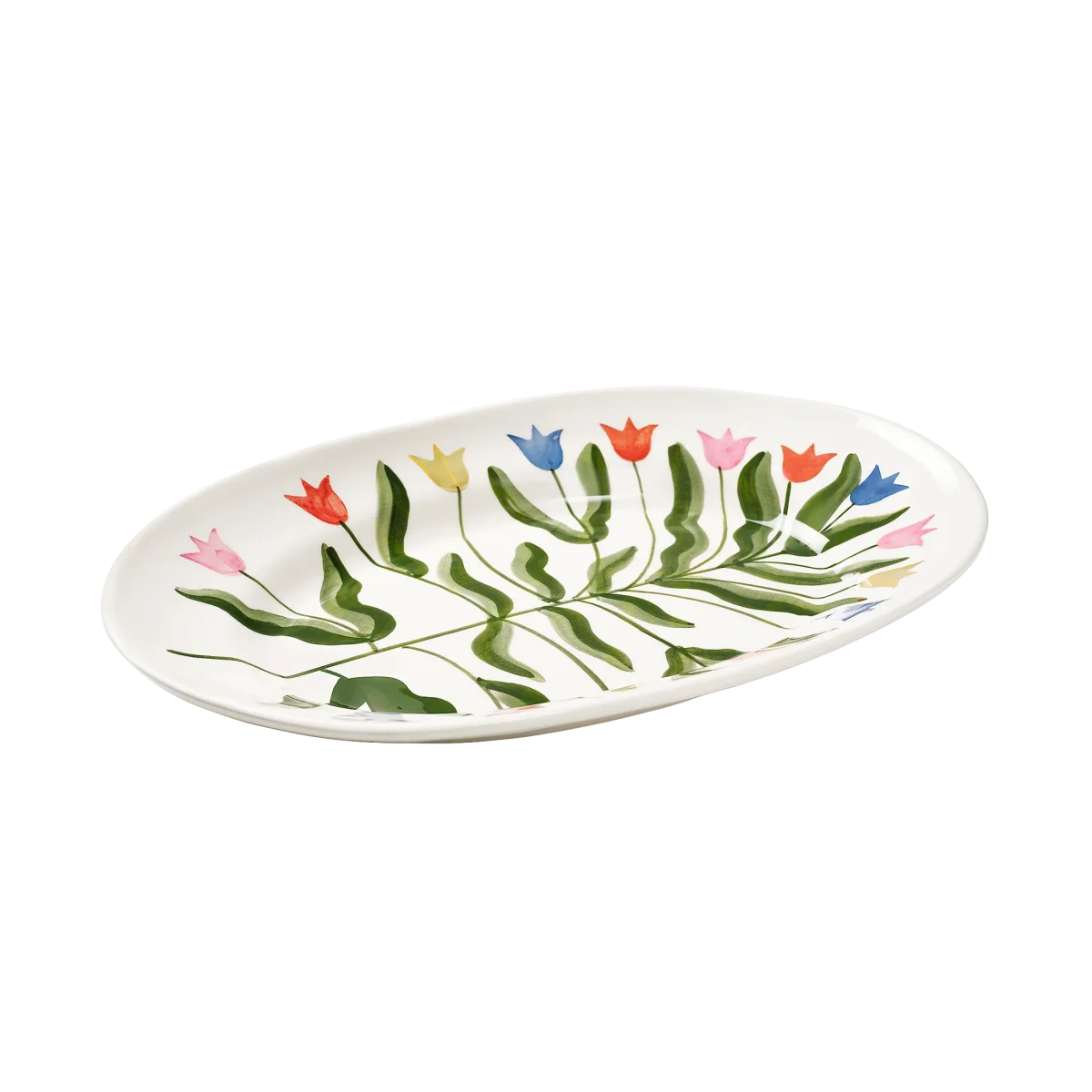 Serveringsfatet Tulip är designad av svenska konstnären och designern Madelen Möllard och skapad av lergods med skickligt hantverk i Portugal. Det blomstrande motivet, inspirerat av vårens blommor, skapar en färgsprakande och inspirerande dukning. Lika fin till frukosten som till festliga sommarmiddagar.