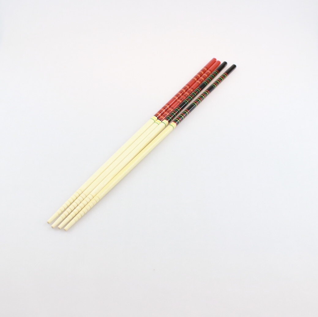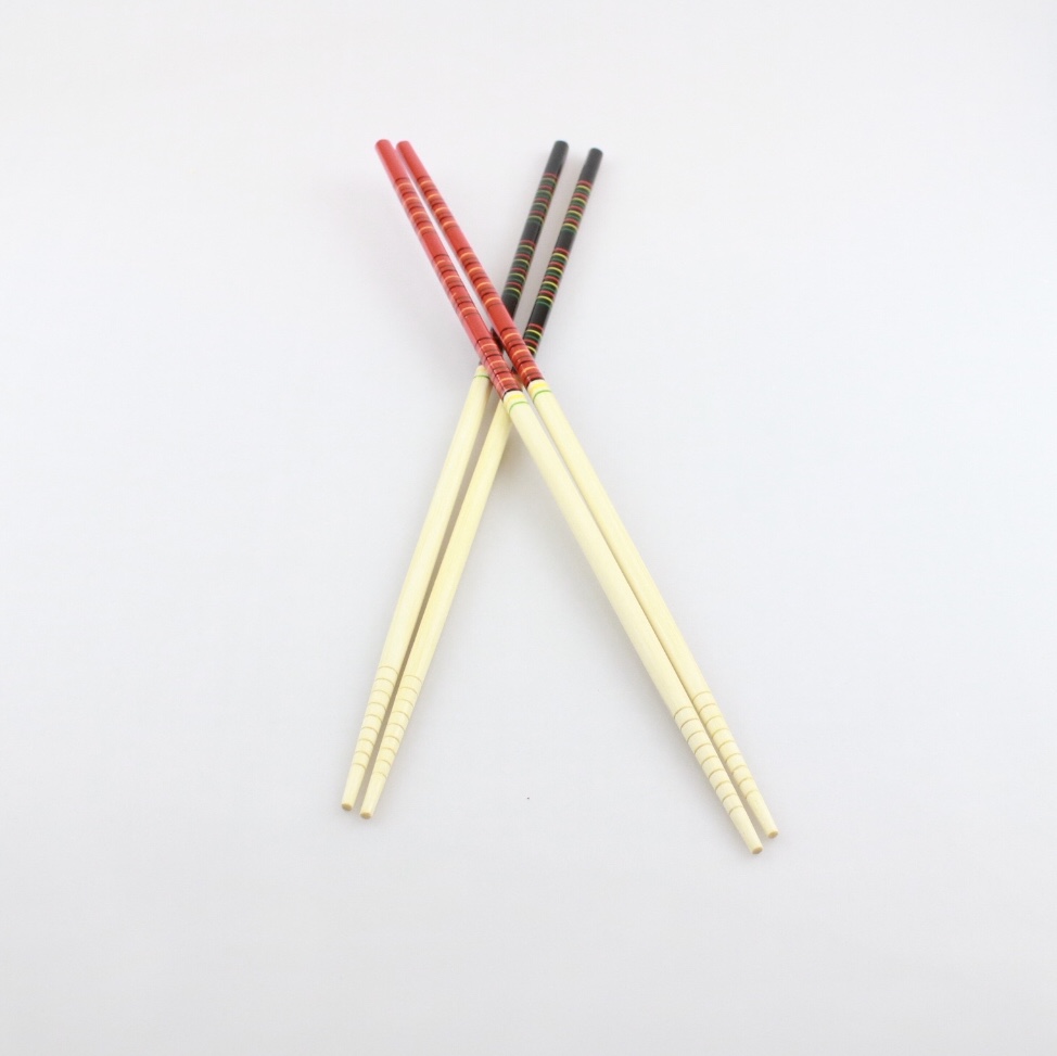 1. Två uppsättningar (alltså 4 pinnar) i ett paket. Ett par svarta och ett par röda. Materialet är bambu och greppytan är lackerad i rött och svart. Längden är 33 cm.