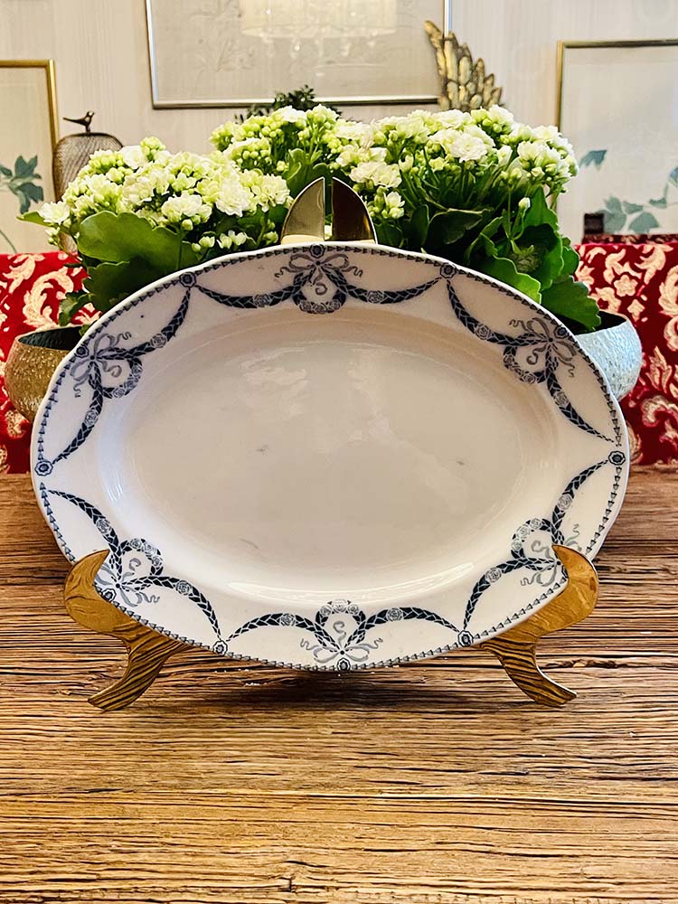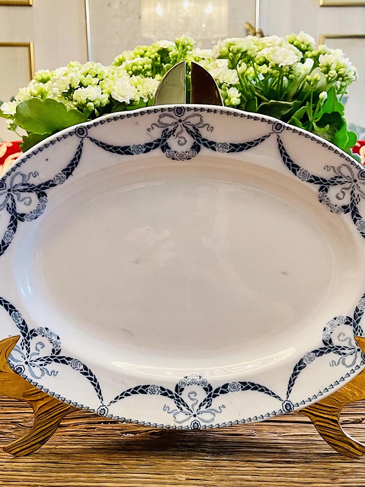Det här är ett uppläggningsfat som mäter 30,5 cm på längden och 23 cm på bredden. Fatet är i mycket fint skick men har sprickor i glasyren som knappt syns på framsidan men är tydligare på baksidan.Fatet har gulnat och det finns spår av färgen från dekoren på fatet.