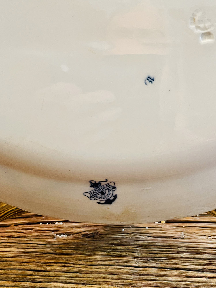 This is a serving dish that measures 30.5 cm in length and 23 cm in width. The dish is in very good condition but has cracks in the glaze that are barely visible on the front but are more evident on the back. The dish has yellowed and there are traces of the color from the decoration on the dish.