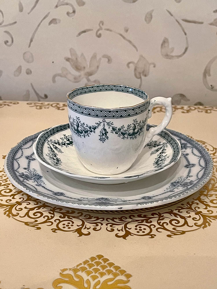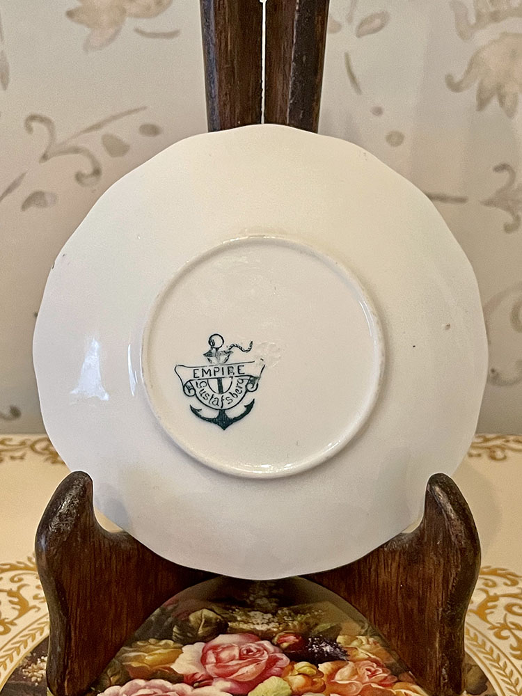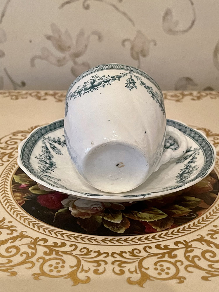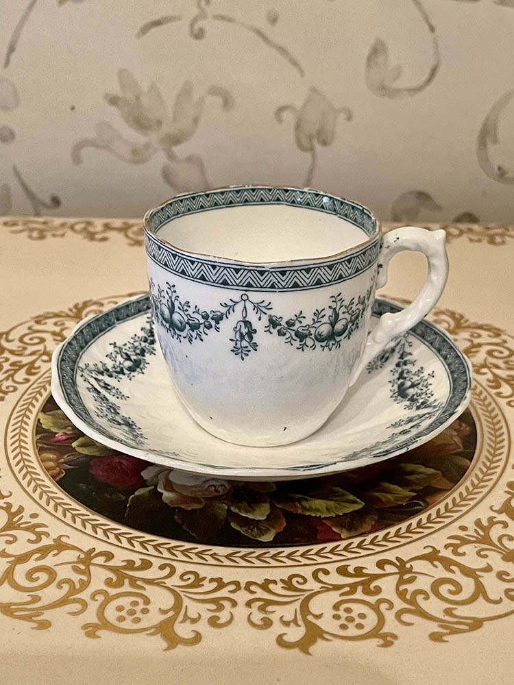 Det här är snart ett antikt porslin från Gustavsberg. Det började tillverkas 1930 och produktionen upphörde troligen 1936. Det är tillverkat i flintgods och de med guldkant i opak. Mönstret är som namnet i empire och det är ett av de vackraste i mitt tycke. De finns tre olika storlekar på kopparna och det här är en mindre kaffekopp. Den är något mindre än de andra kaffekoppen och har en rundare modell. Tre av kopparna har en guldkant på koppen. Guldet har slitage, men samtliga koppar är i samma kvalitet. De här kopparna är i ett förhållandevis mycket bra skick .Kaffekopparna precis som tekopparna var betydligt mindre förr. Koppen är 6,5 cm hög och mäter ca 6,5 cm i diameter, och fatet mäter 12 cm i diameter. Det finns ingen tillhörande assiett men det går utmärkt att kombinera med en assiett från de andra modellerna av det antika porslinet från Gustafsberg då de samtliga har ungefär samma gröna nyans. Kopparna är i fint bruksskick. Gustafsbergs porslin var oftast vardagsporslin och har nästan alltid ett visst slitage.