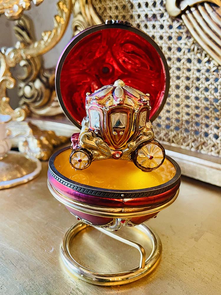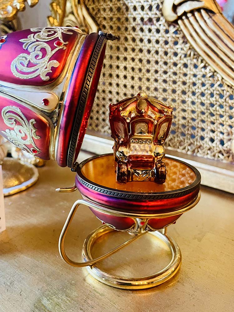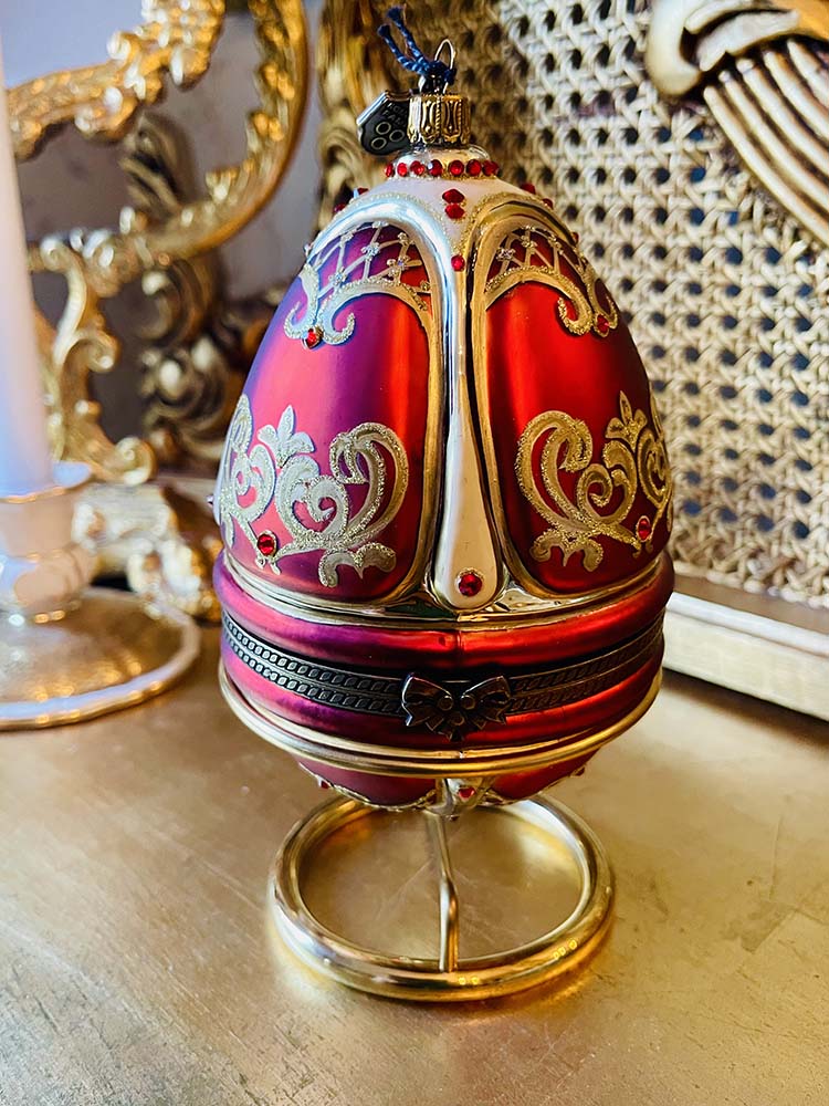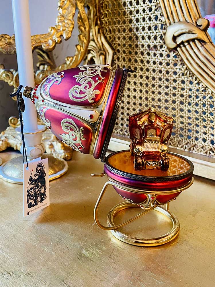 Ett helt fantastiskt julägg i Fabergé stil. Det är helt uppbyggt i glas med en hållare i mässing. Ägget är stort och mäter 16 cm och med hållare mäter den 19 cm. Inuti ägget är glaset rött för att framhäva den vackra lilla karossen. Det här ett litet under i glaskonst. Ägget ligger i sin originalask och har aldrig varit använt, etiketterna hänger kvar. Ägget ska fästas på sin hållare i mässing som består av två delar som man sätter ihop. Man spänner försiktigt upp ringen och fäster ägget i ringen så att den fastnar i skåran för att den ska stå stadigt.