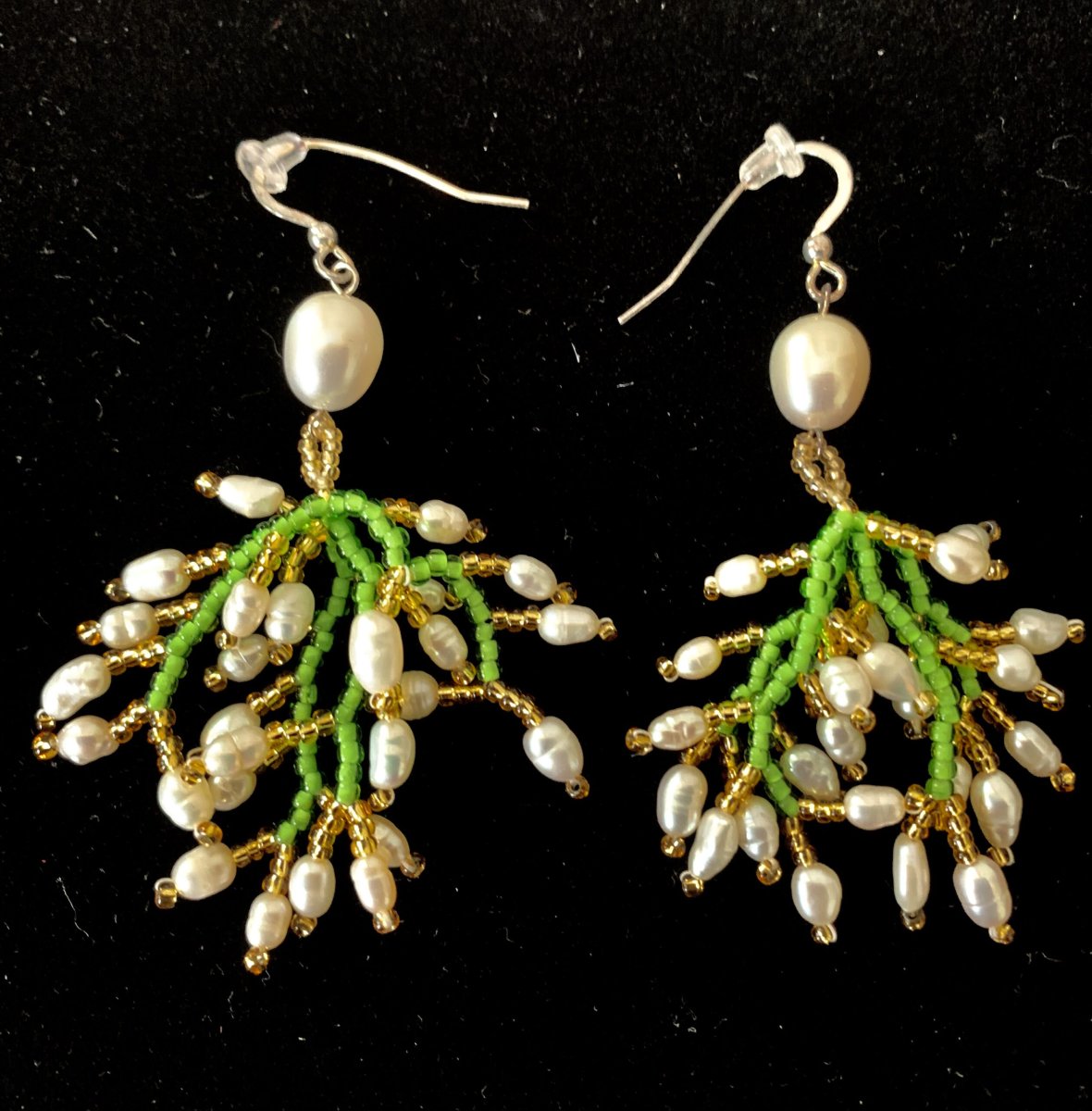 A pair of very beautiful earrings made by a jewelry artist from Ukraine. The tradition is very old and she has developed it into her own modern design. The earrings are made of small glass beads and freshwater pearls. A matching necklace can be purchased separately for the earrings.
