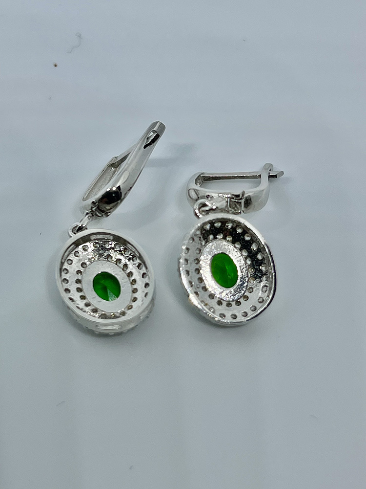 Klassiskt vackra silverörhängen med gröna stenar. De är tillverkade i sterlingsilver och det är ett fint arbete. Troligen är de vita stenarna cubic zirconia och den gröna stenen är en syntetisk smaragd. Hela örhänget mäter 3 cm och hängets längd är 1,5 cm. Hur gamla de är och varifrån de kommer vet jag tyvärr ej, men de är i nyskick och har aldrig använts.