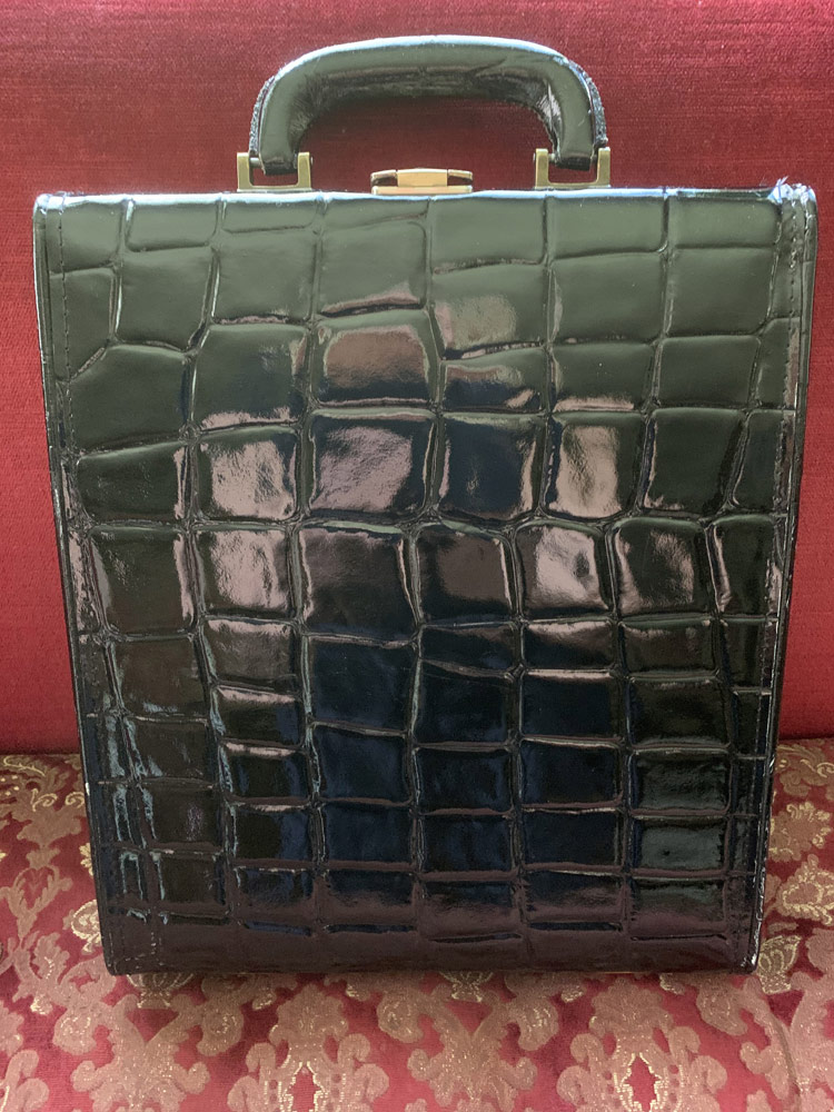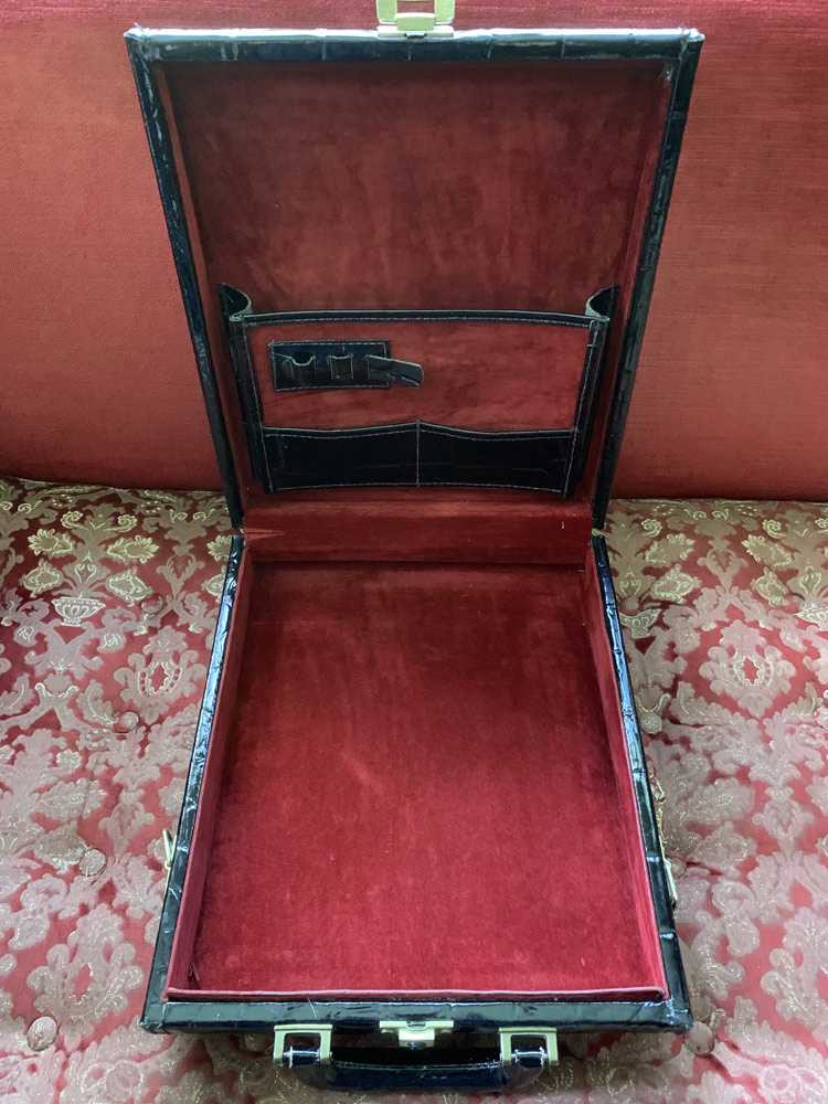 Very elegant vintage briefcase in crocodile-embossed leather. The surface is in patent leather and the fittings are gilded brass. Inside it is lined with red velvet. There is the possibility of attaching a shoulder strap, but it is not included. Nor is there a key for the lock. A MacBook Air 13 fits perfectly in the briefcase. The briefcase is in very good condition.