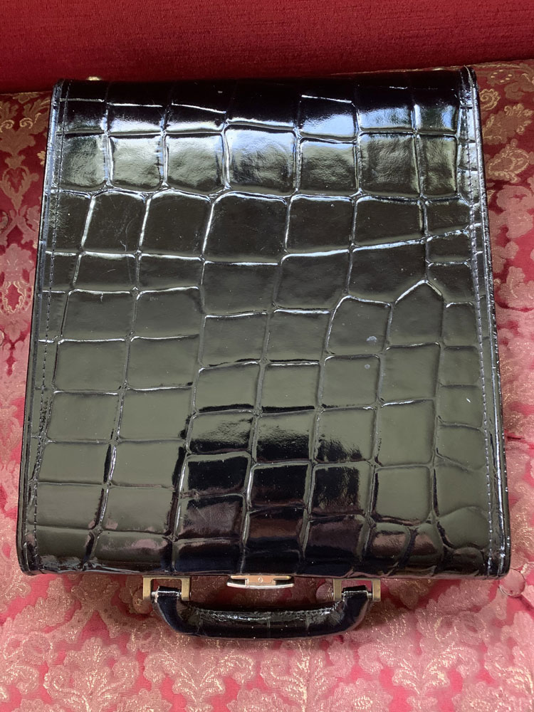 Mycket elegant vintageportfölj i krokopressat läder. Ytan är i lack och beslagen är förgyllt mässing. Inuti är den klädd med röd sammet. Det finns möjlighet för att fästa ett axelband med det medföljer inte. Inte heller finns det någon nyckel till låset. En MacBook Air 13 passar perfekt i portföljen. Portföljen är i mycket fint skick.