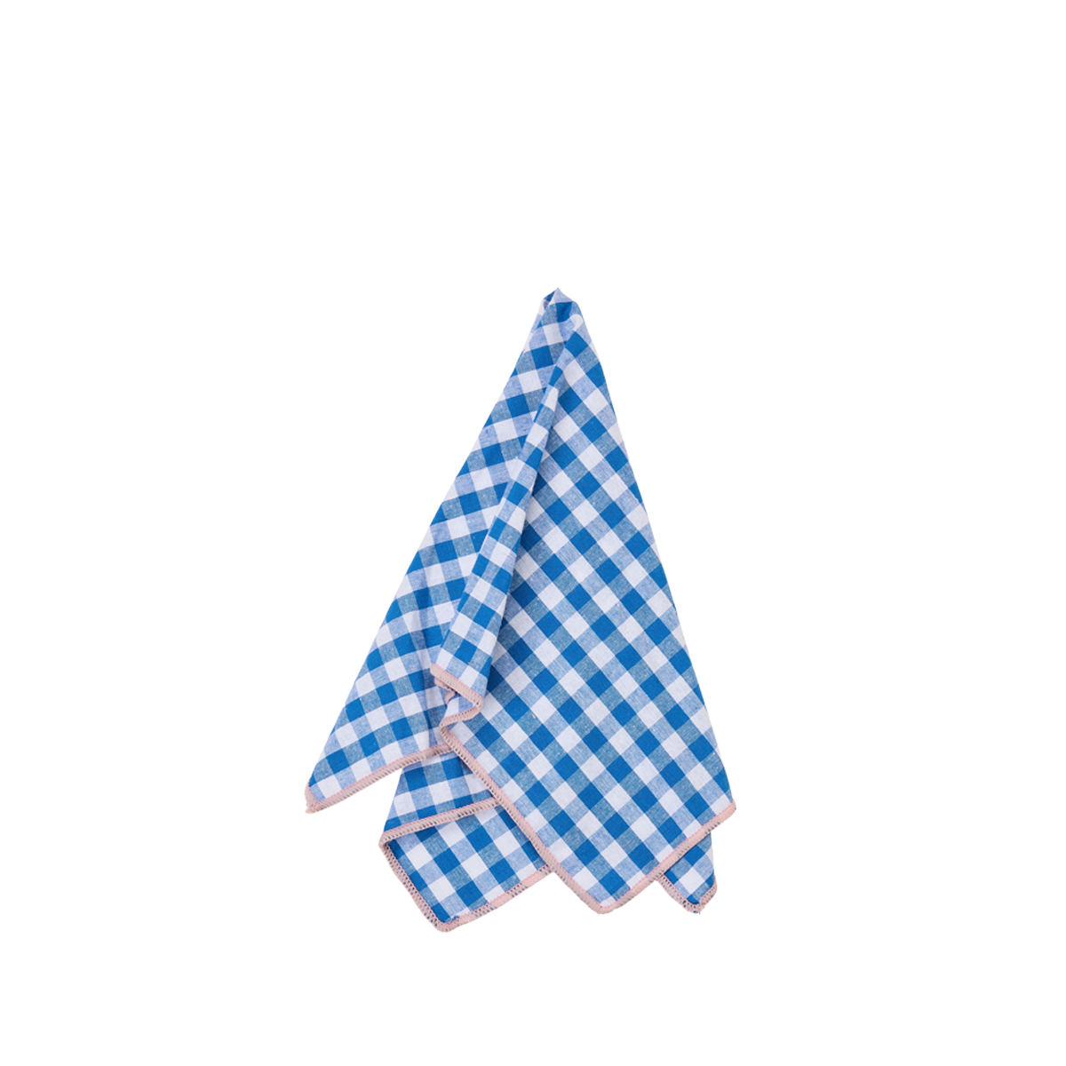 Blårutig servett med vackert broderad rosa kant som ger dukningen en charmig detalj.