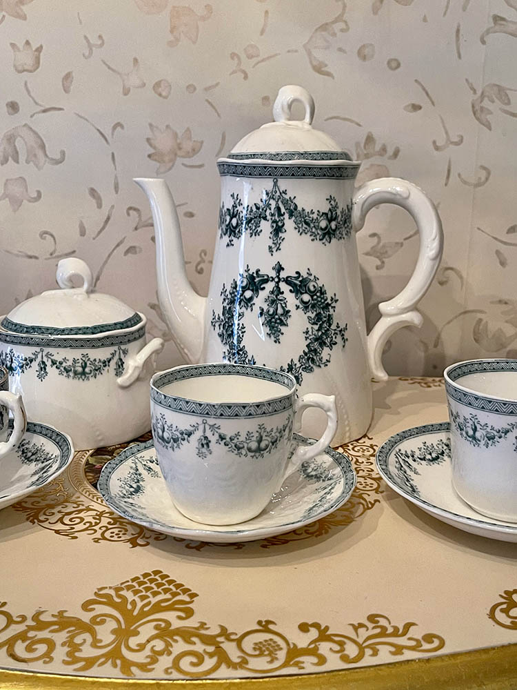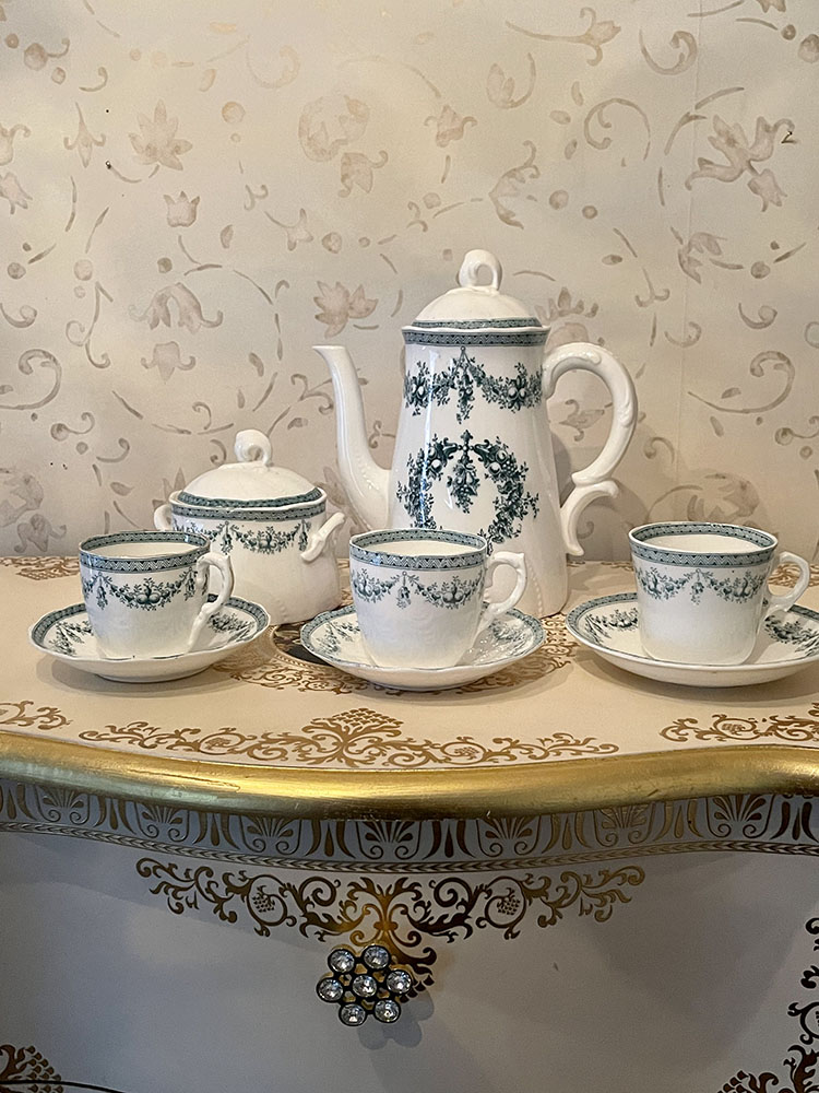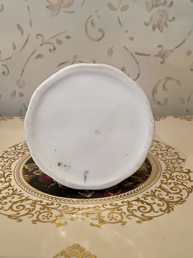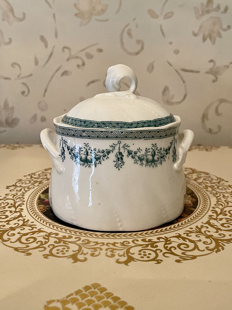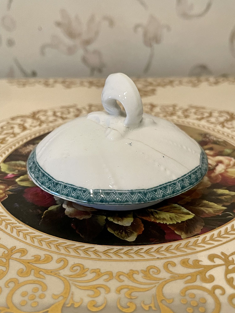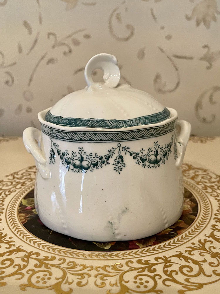 Det här är snart ett antikt porslin från Gustavsberg. Det började tillverkas 1930 och produktionen upphörde troligen 1936. Det är tillverkat i flintgods och de med guldkant i opak. Mönstret är som namnet i empire och det är ett av de vackraste i mitt tycke. Det här är sockerskålen som tillhör servisen . Den är ca 11 cm hög med lock och mäter 11 cm i diameter i botten. Sockerskålen är i nyskick men någon har tappat locket, så det är lagat. Lagningen är nästan osynlig ovanifrån men det fattas en bit undertill som framgår av bilden. Det finns färg under glasyren på ena sidan och i botten som är från tillverkningen. Gustafsbergs porslin var oftast vardagsporslin och har nästan alltid ett visst slitage.