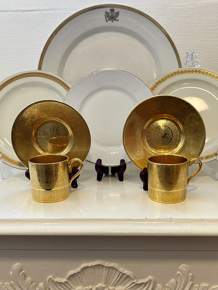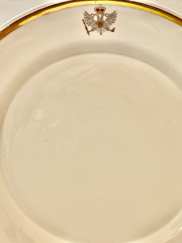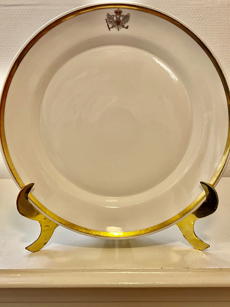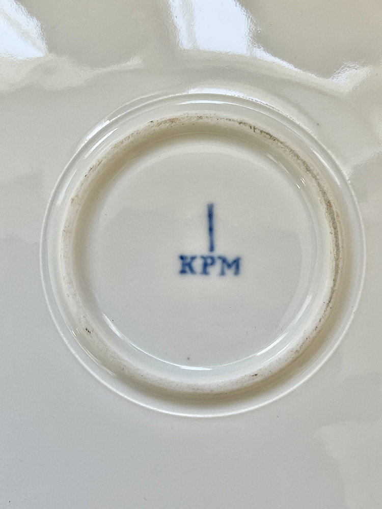Ett fantastiskt stort fat från Tyska KPM ( Königliche Porzellan Manufaktur) som grundades av Fredrik den store 1763 i Berlin, Tyskland och som fortfarande är i bruk . Fatet är antikt och har tillverkats mellan 1837-1844. KPM har tillverkat porslin under 250 år och producerade hög kvalitativt porslin som är mycket eftersökt idag. Dubbelörnen på fatet visar att det är Kungligt porslin från Prins Dudolstadt. Det har tillhört Sovereign Prins Friedrich Gunther som regerade 1814-1866 i Schwartzburg, Rudolstadt. Sätet var Heideckesburg slott i nuvarande Thuringen i Tyskland. Fatet är i mycket fint skick, men det finns ett lätt slitage på guldranden och några mycket lätta knivspår på porslinet. Fatet är stort och mäter 29 cm och är 5 cm högt.