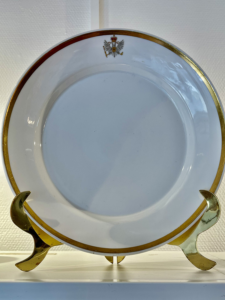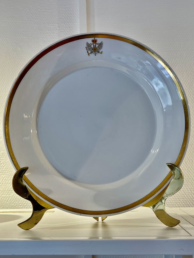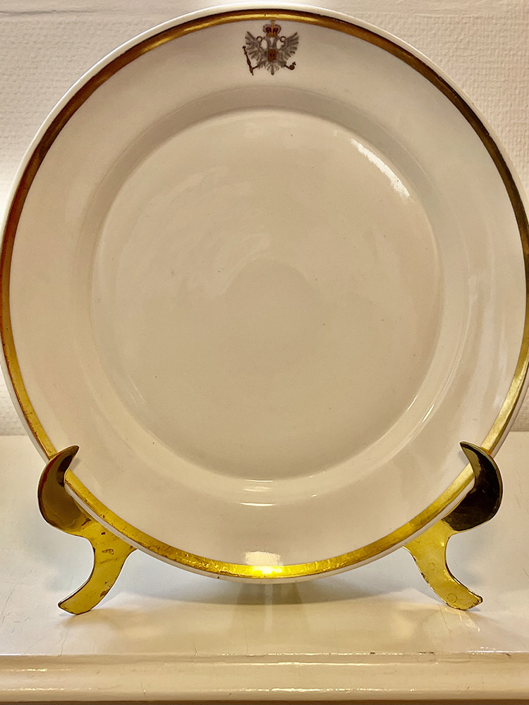 A fantastic large dish from the German KPM (Königliche Porzellan Manufaktur) which was founded by Fredrik the Great in 1763 in Berlin, Germany and which is still in use. The dish is antique and was manufactured between 1837-1844. KPM has manufactured porcelain for 250 years and produced high quality porcelain that is much sought after today.The double eagle on the plate shows that it is Royal porcelain from Prince Dudolstadt. It belonged to the Sovereign Prince Friedrich Gunther who ruled 1814-1866 in Schwartzburg, Rudolstadt .The residence was Heideckesburg Castle in present-day Thuringia, Germany.The dish is in very fine condition, but there is a slight wear on the gold edge and some very light knife marks on the porcelain.The barrel is large and measures 29 cm and is 5 cm high.
