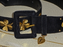 Dramatiskt bälte från Yves Saint Laurent. Det är i svart mocka med dekor av guldfärgade fyrklöver och nitar. Loggan hänger i form av ett hjärta på bältet. Storleken är 75/30. Bältet är från slutet av 1970 till början av 1980-talet. Det är i mycket fint bruksskick, endast ett par stjälkar fattas på fyrklövern. Yves Saint Laurent var en Fransk modeskapare som dominerade 1900-talets mode. Han startade sitt modehus 1962 och det övertogs 2002 av en annan koncern när han slutade.