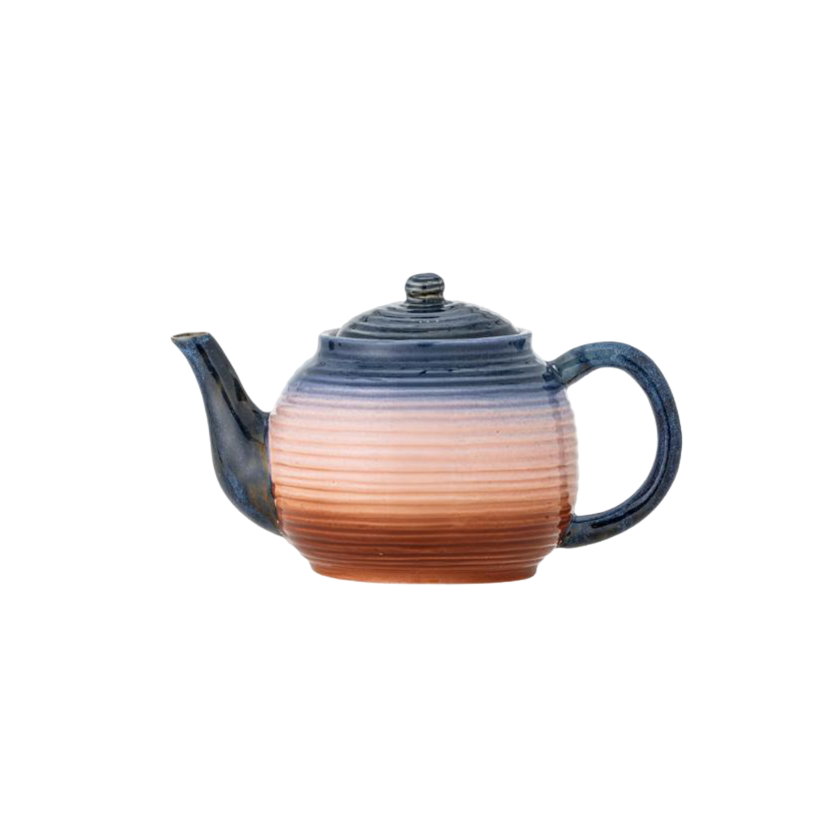 Tatum Tekanna med Teastrainer är en tekanna i stengods med en glaserad yta som skapar en vacker blandning av djupblå, rosa och rödaktiga rosttoner. Den räfflade strukturen ger ett lugnt och harmoniskt utseende. Små variationer i färg och mönster kan förekomma, vilket gör varje tekanna unik.