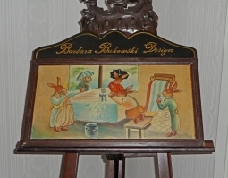 Det här är en tavla från Bukowski design. Den är handmålad på en träplatta. Motivet är några kaniner runt ett köksbord. Det har varit svårt att få fram någon information runt tavlan, men av vad jag kan förstå så är den inte längre i produktion. Den verkar vara från ett tidigt skede i företaget. Tavlan är sällsynt på marknaden. Den är i fint skick, men har lite avskavd färg i de nedre hörnen. Barbara Bukowski Design startades 1990 med att designa nallar och kaniner. Inspirationen hämtades från gamla Tyska och Engelska modeller.