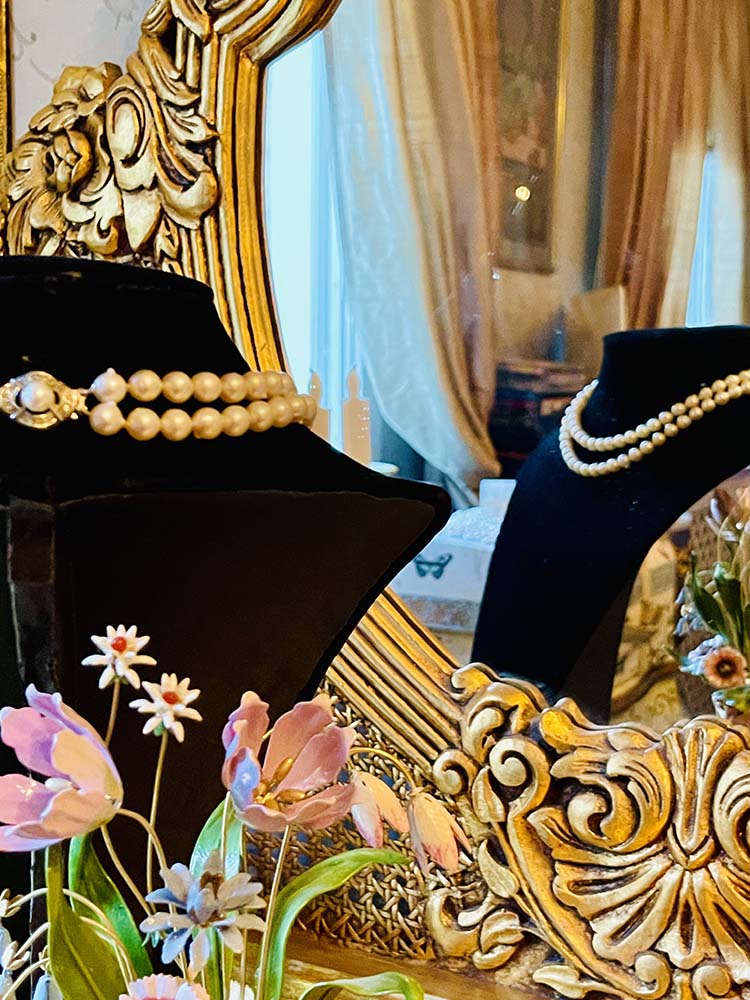 A double row pearl necklace made of cultured freshwater pearls. These pearls are large and unusually round and even. The pearls have a small knob that I think is a fastener to the shell of the mussel. The pearls measure 8 mm throughout and can vary slightly, both larger and smaller. The necklace has a very beautiful clasp in 835 silver set with white stones that sparkle nicely. There is also a small real pearl on the clasp. The inner row measures 39 cm with the clasp and the outer 43 cm, so it sits quite high up on the neck. The clasp is stamped JK8 which stands for Jutta Klink who is a jewellery designer from Stuttgart. She has completed the university for design, jewellery and art objects. After collaborating with other jewellery designers, she opened her jewellery shop, Joaillerie Stuttgart in 2016. Her jewellery can be seen on her Instagram page. A classic pearl necklace in very high quality made by a modern jewelry designer.