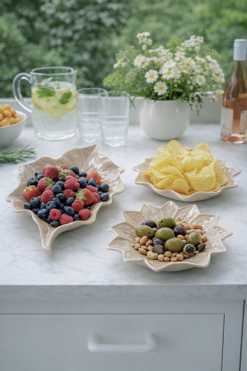 Två stycken vackra uppläggningsfat av beige keramik i form av blad. Passar perfekt för sallader, grönsaker, snacks, godis, kakor, mm. Eller bara fina som de är som en del av inredningen. Finns i beig och grön.