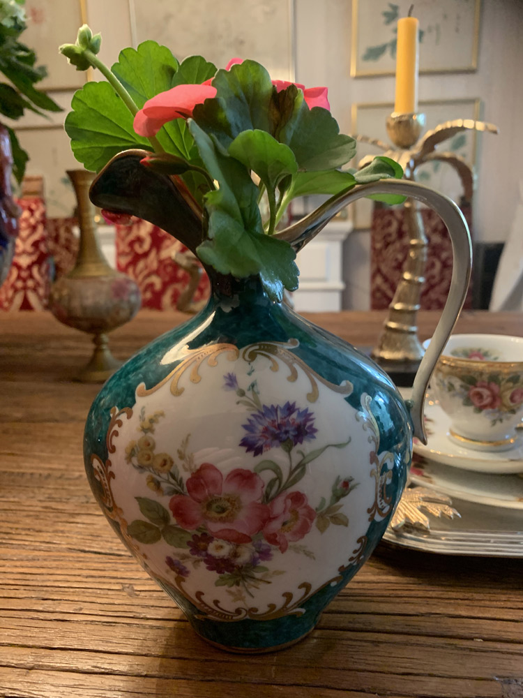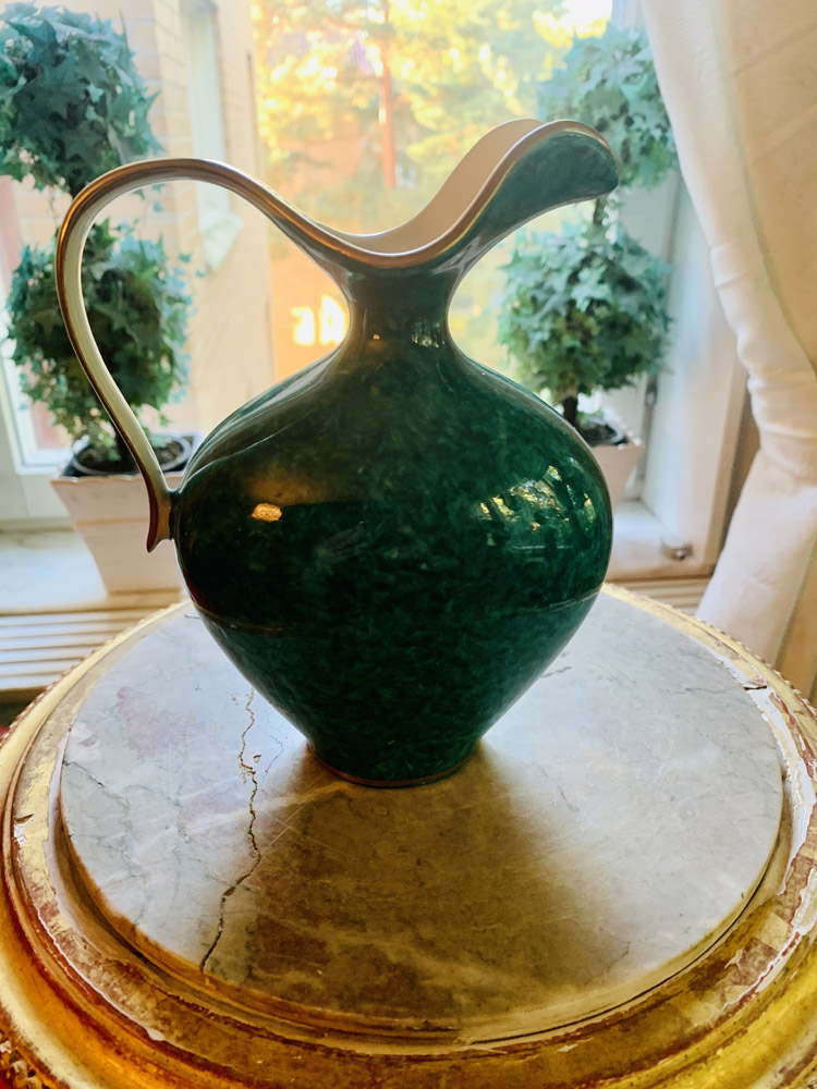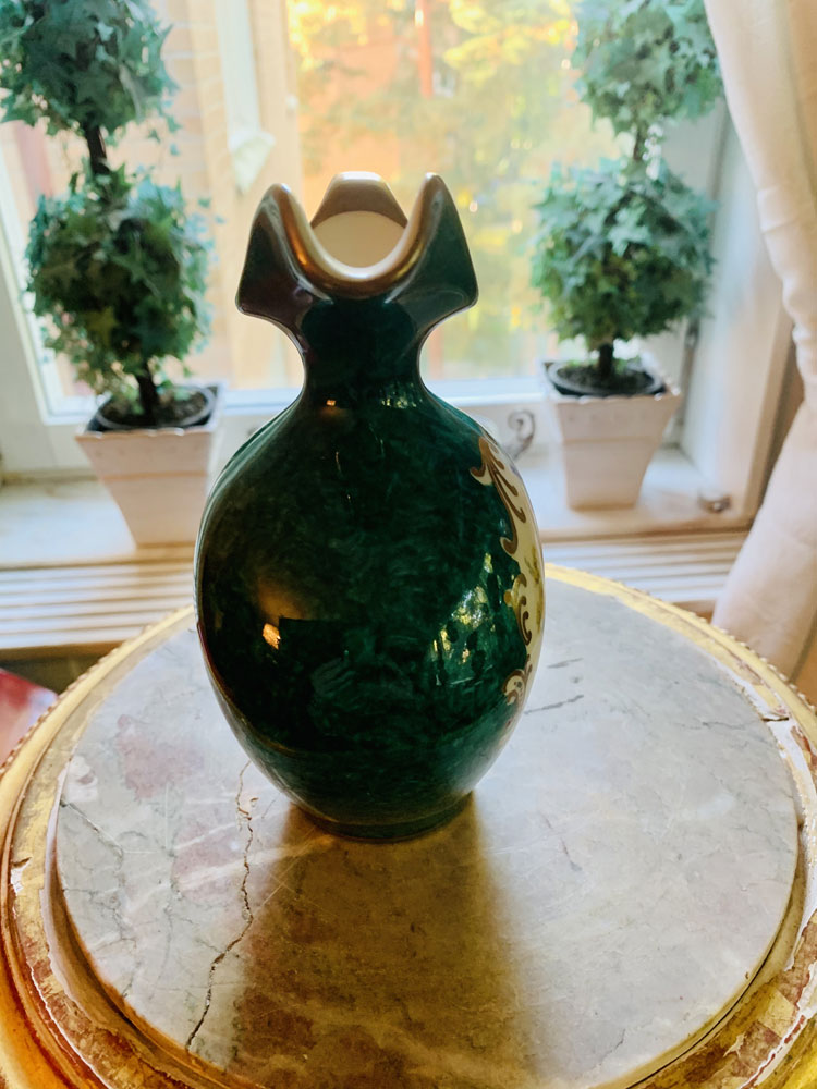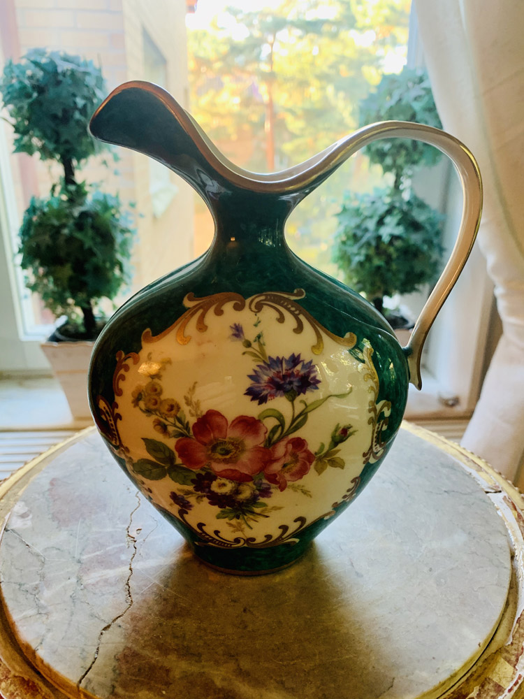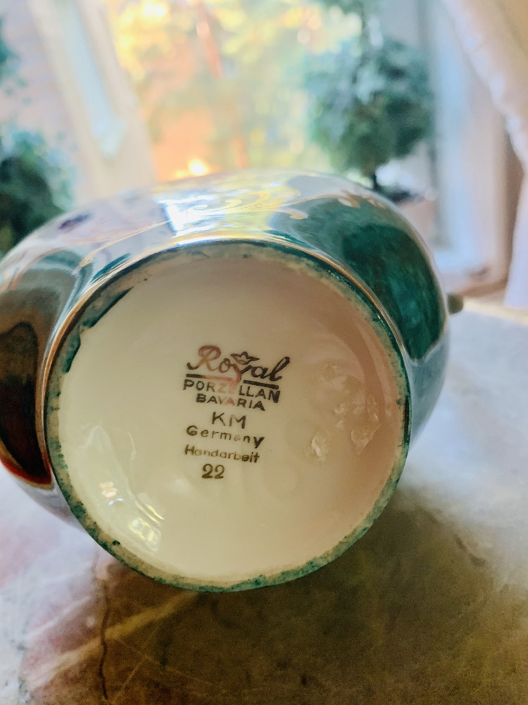 Vacker handmålad vas med 22 karats förgyllning från KM Bavaria Tyskland. Vasen är gracil och mycket välgjord. Den är 18 cm hög och ca 16 cm bred med handtaget. Vasen är i mycket fint skick och den borde vara tillverkad runt 1950-talet. Troligen är tillverkaren ett företag som hette Kerafina. Det är ett av många som försökt efterlikna det berömda porslinet som har inisialerna KPM och är ett mycket dyrbart porslin.