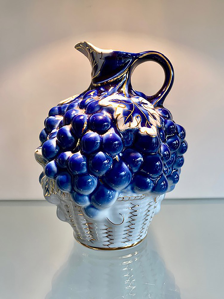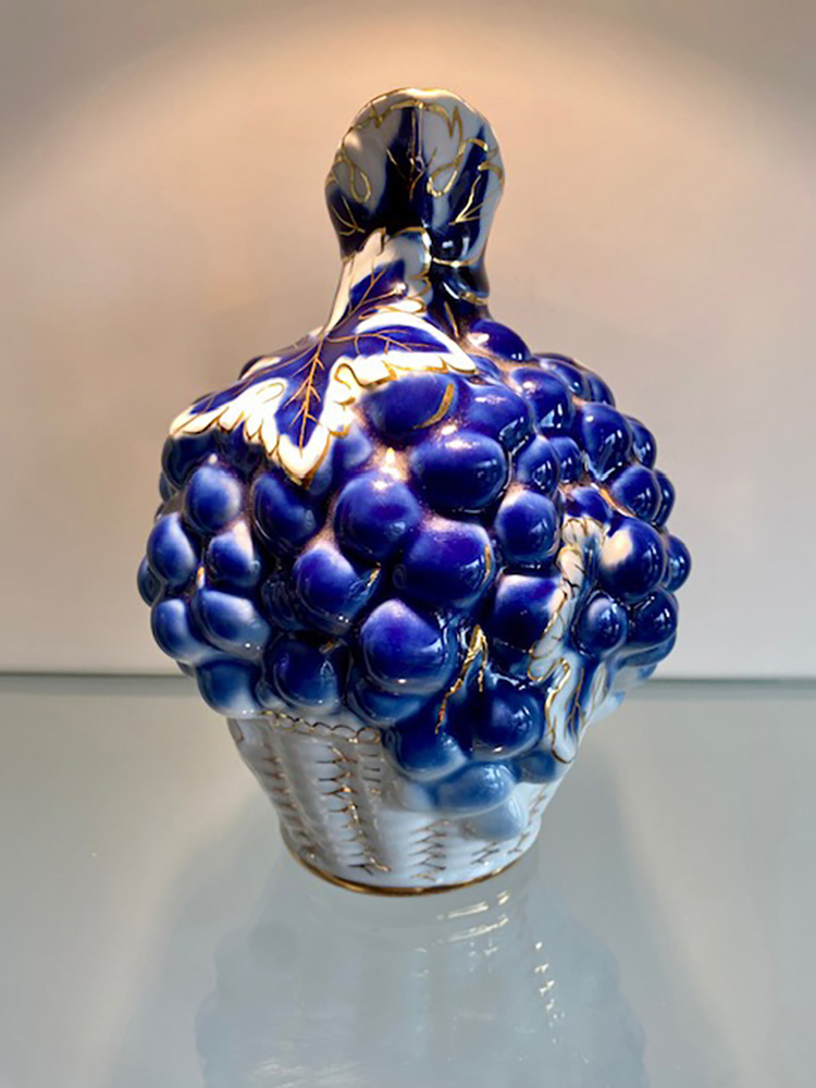 Det här är en vinkanna från Lomonosov . Porslinet är vitt och koboltblått med en dekor i 22 karats guld. Den är handmålad.Stämpeln säger att den tillverkad någon gång mellan 1936-1991 men i det här fallet säger färgen att den är gjord efter 1970. Den är stämplad med röd färg vilket betyder att den håller högsta kvalitet. Kannan mäter 20 cm på höjden och är i nyskick. 1744 startade Peter den Stores dotter Elisaveta fabriken. 1765 tog man namnet, Imperial Porcelain. De var mycket tidiga med att framställa ett fint porslin. Fabriken har bytt namn flera gånger sedan dess men fick namnet Lomonosov 1925. Företaget privatiserades 1993 och bytte namn till 2005 till ursprungsnamnet Imperial Porcelain.